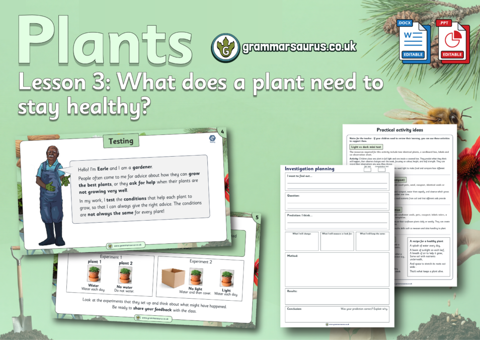 This editable differentiated lesson pack focuses on the conditions that plants need to stay healthy. Children explore the five key requirements for growth: air, water, light, nutrients and space. They learn how scientists change one variable at a time, make predictions. They plan and carry out a comparative test, observing plants over several weeks to compare how different conditions affect growth.