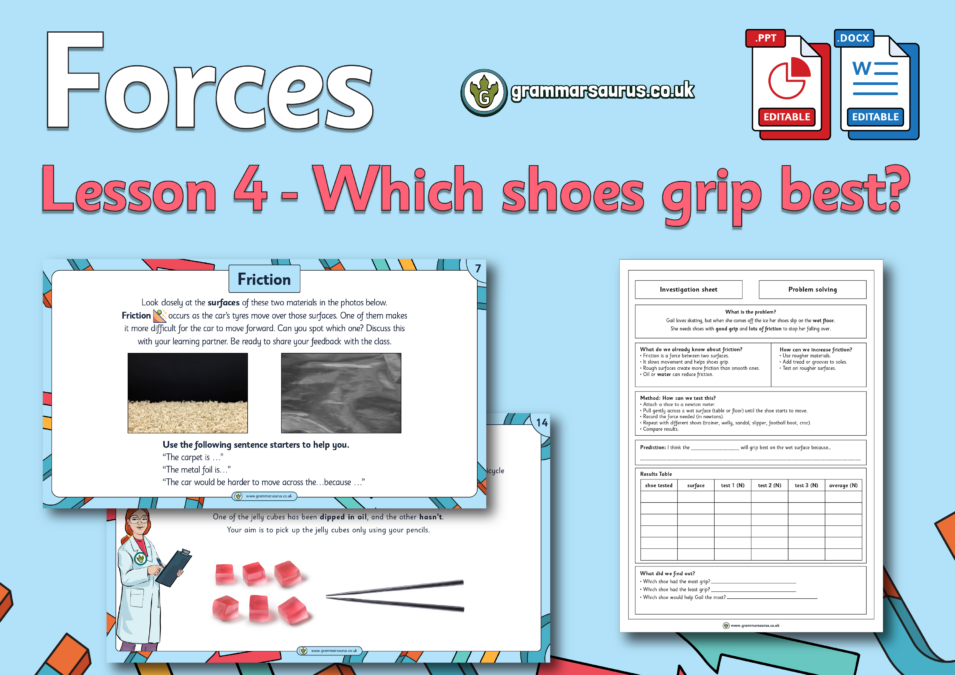 This editable differentiated lesson pack focuses on the effect of friction between two surfaces. Children solve the problem of which shoes are the best to wear on a slippery wet floor by carrying out tests on different shoe types.