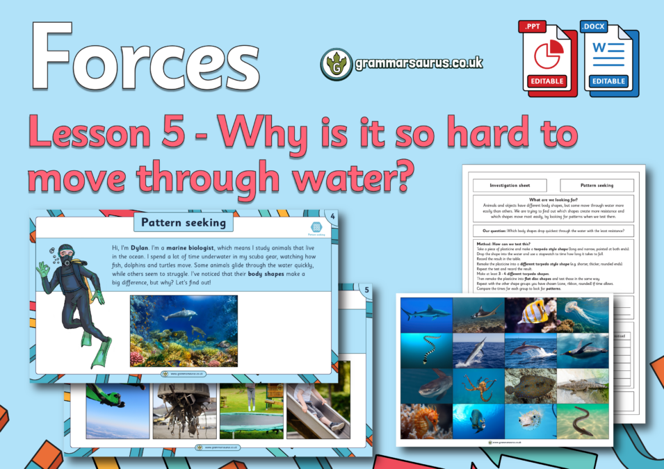 This editable differentiated lesson pack focuses on the effect of water resistance. Children investigate how quickly streamlined shapes drop through water.