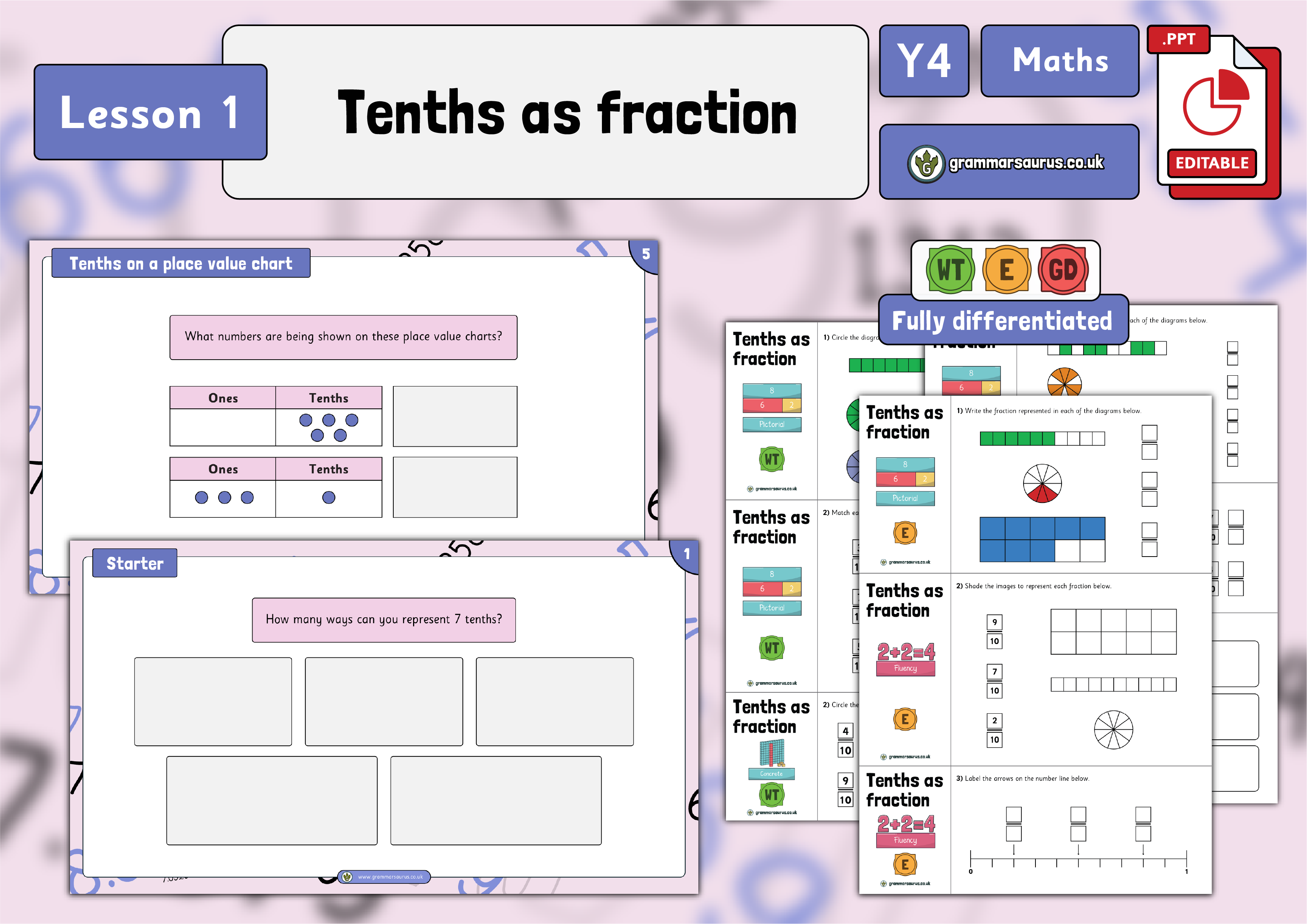 In this lesson, children build on their understanding of hundredths from lesson 1. Children will also be taught how to partition hundredths numbers, and represent hundredths in different ways. There is a teaching presentation accompanied by differentiated activities with a range of fluency, reasoning and problem-solving questions.