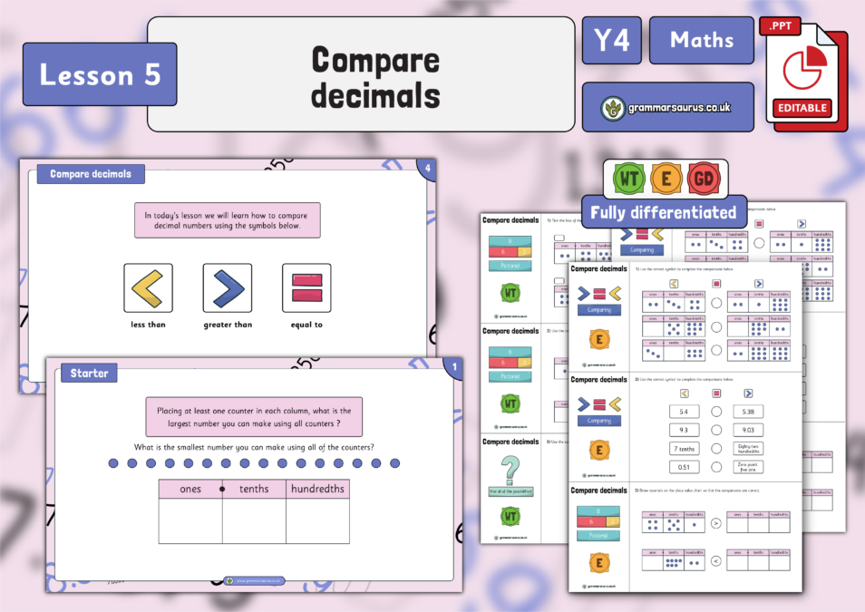 In this lesson, children will learn to compare decimals with up to 2 decimal places, using a range of representations to support their learning. There is a teaching presentation accompanied by differentiated activities with a range of fluency, reasoning and problem-solving questions.