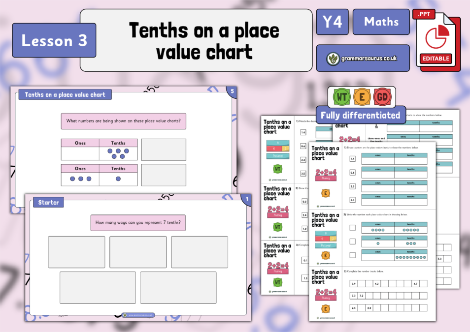 In this lesson, children build on their understanding of tenths. They learn how to read and represent ones and tenths on a place value grid. There is a teaching presentation accompanied by differentiated activities with a range of fluency, reasoning and problem-solving questions.