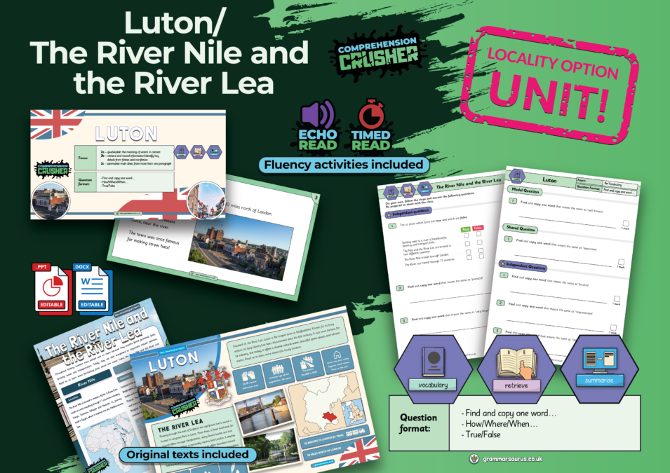 This comprehension crusher reading scheme pack includes two non-fiction texts. The first text is a non-chronological report about Luton. It has been written to meet the Year 4 expected standard and comes with three sets of comprehension questions, based on three curriculum content domains (vocabulary, retrieval and summarise). The teaching slides provided, along with the questions sets, allow for in-depth practice of each individual question type.