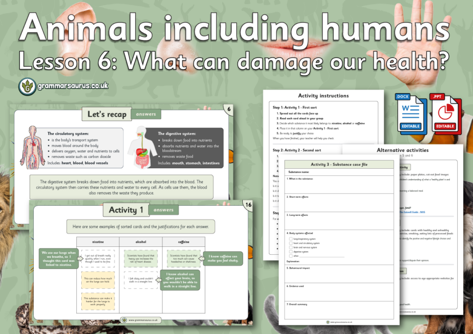 This editable differentiated lesson pack focuses legal and illegal drugs and how they can cause damage to our health. Children will learn the effects of alcohol, nicotine and cafeine on the body's systems. The file includes the following resources: - editable teaching presentation - Teacher MASTER card set - editable activity instructions - editable sorting cards - editable sorting tables A4 and A3 - editable substance case file - editable alternative activity ideas (lesson 5 and 6) - editable lesson plan - editable focus assessment worksheet – editable google slides presentation National Curriculum objectives