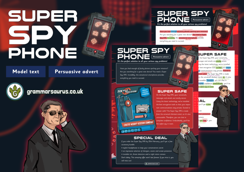 This Year 3 model text is persuasive advert about a new high-tech spy phone. It has been written to meet the Year 3 expected standard and comes with a handy annotated version detailing the text-type specific features (red), grammar (green), punctuation (purple) and spelling (blue) teaching opportunities should you wish to use this text with your learners.