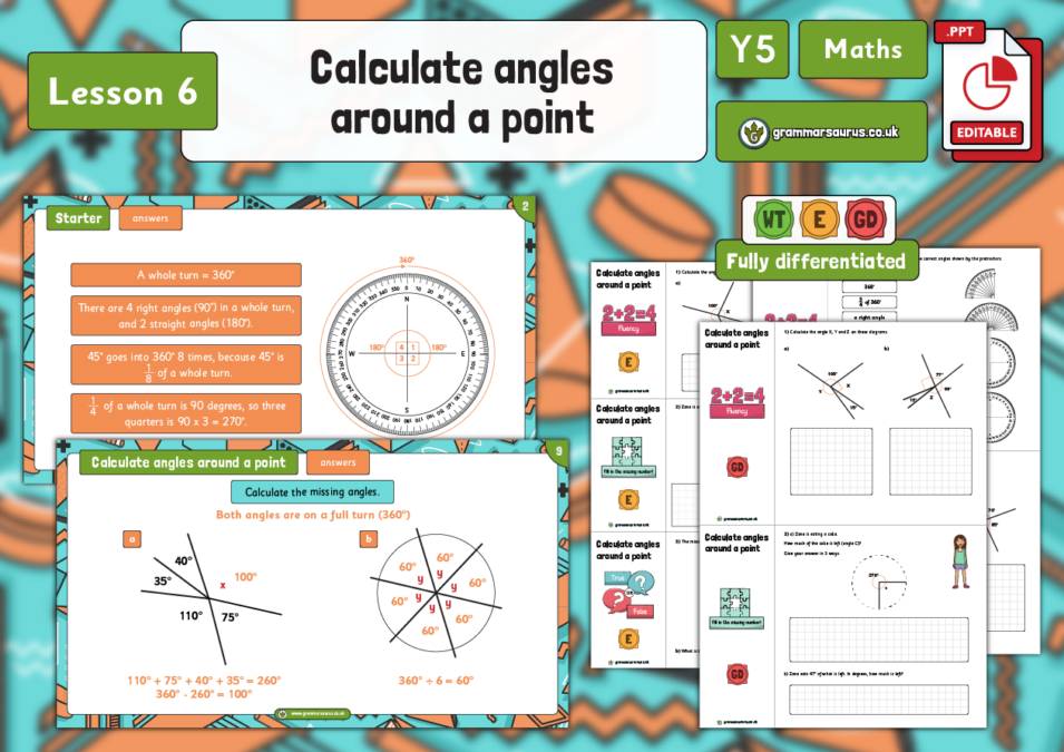 In this lesson, children should recognise that a half turn is the same as a straight line and use the knowledge that a half turn is 180° to calculate missing angles on a straight line. This lesson includes a teaching presentation accompanied by differentiated activities with a range of fluency, reasoning and problem-solving questions, as well as 3 sets of extra fluency questions. National curriculum objectives