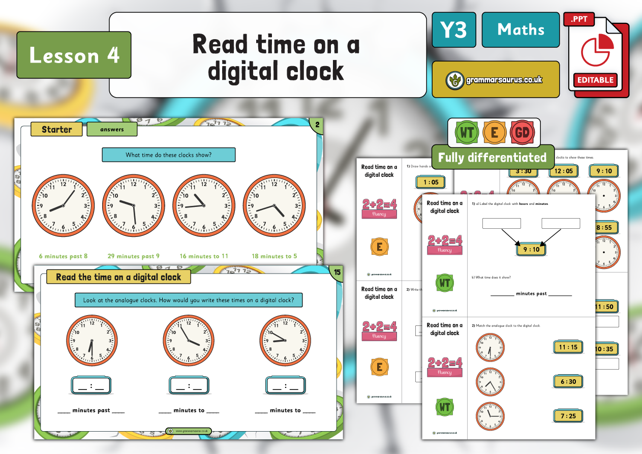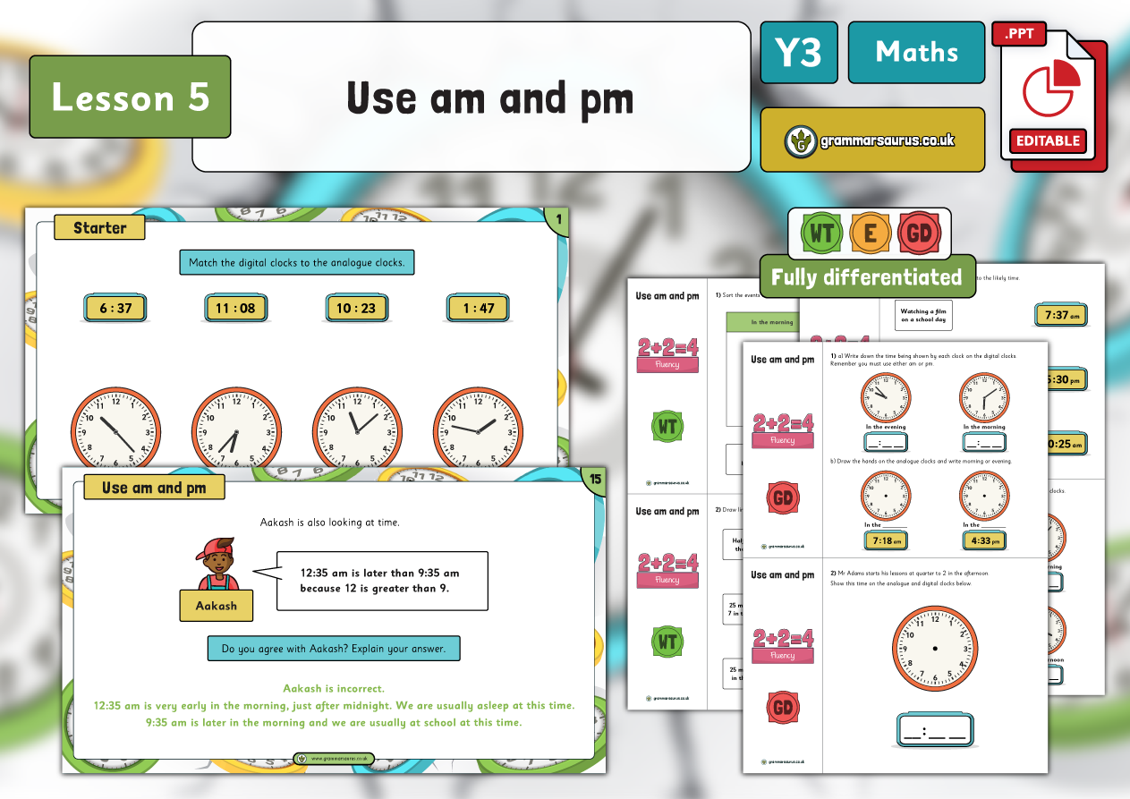 Estimate and read time with increasing accuracy to the nearest minute; record and compare time in terms of seconds, minutes and hours; use vocabulary such as o’clock, am/pm, morning, afternoon, noon and midnight
