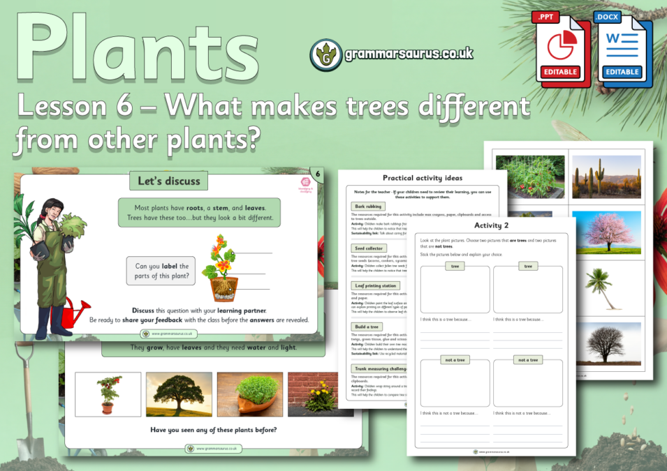 This editable differentiated lesson pack focuses on helping children understand what makes a tree a tree. Through careful observation and simple classification activities, pupils learn that trees have key features such as a trunk, branches, bark and leaves, and that these features look different from the soft stems of other plants. This lesson strengthens children’s ability to identify living things and builds confidence in recognising the structures that make trees unique.