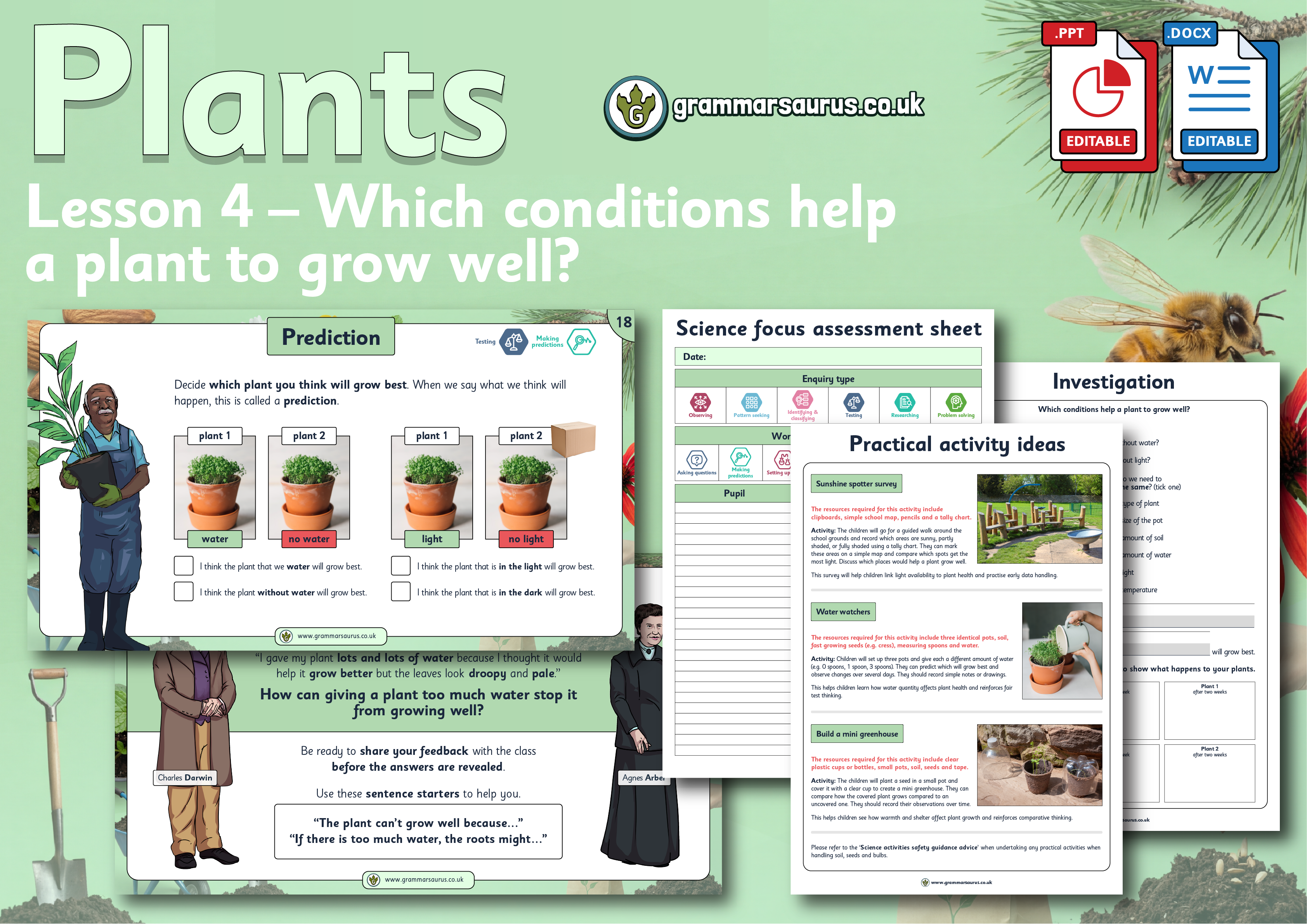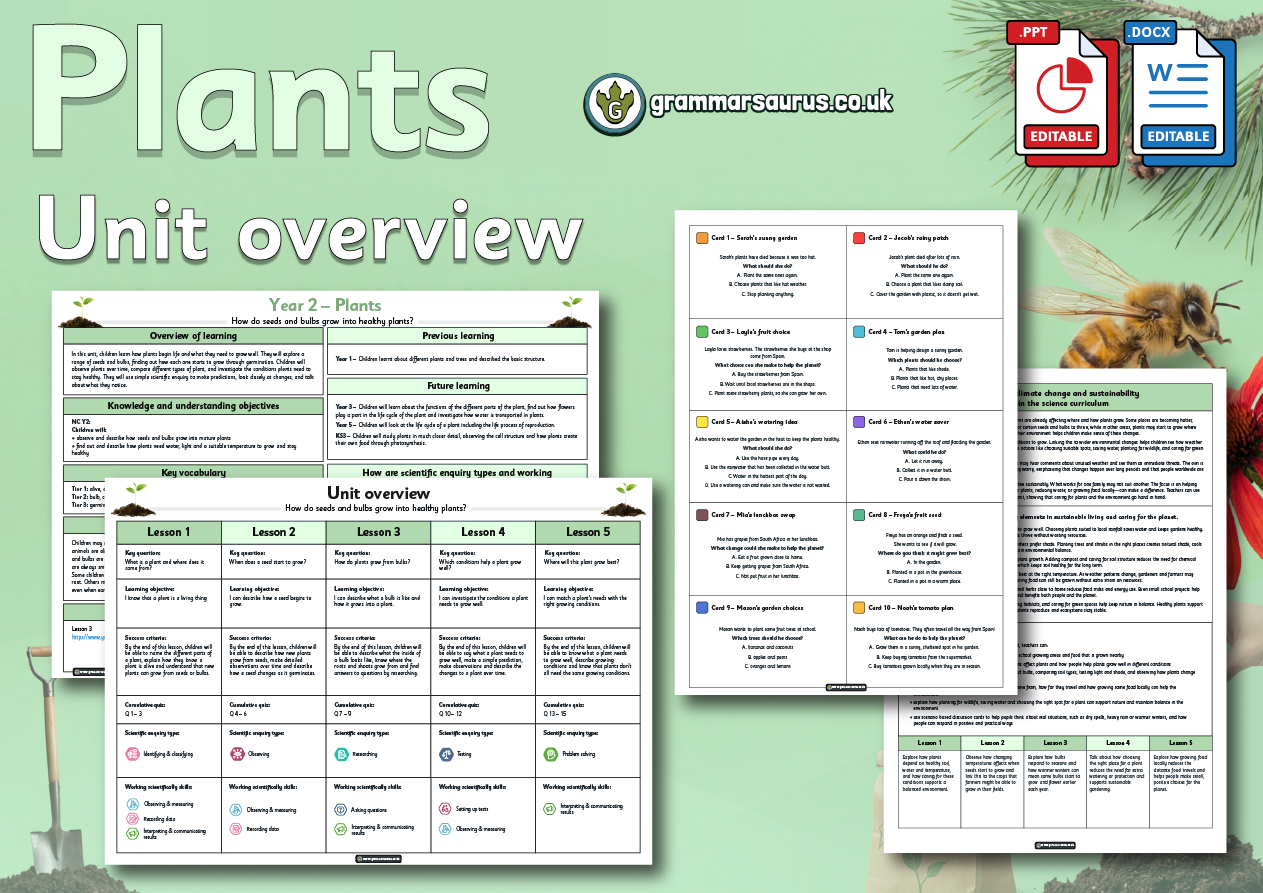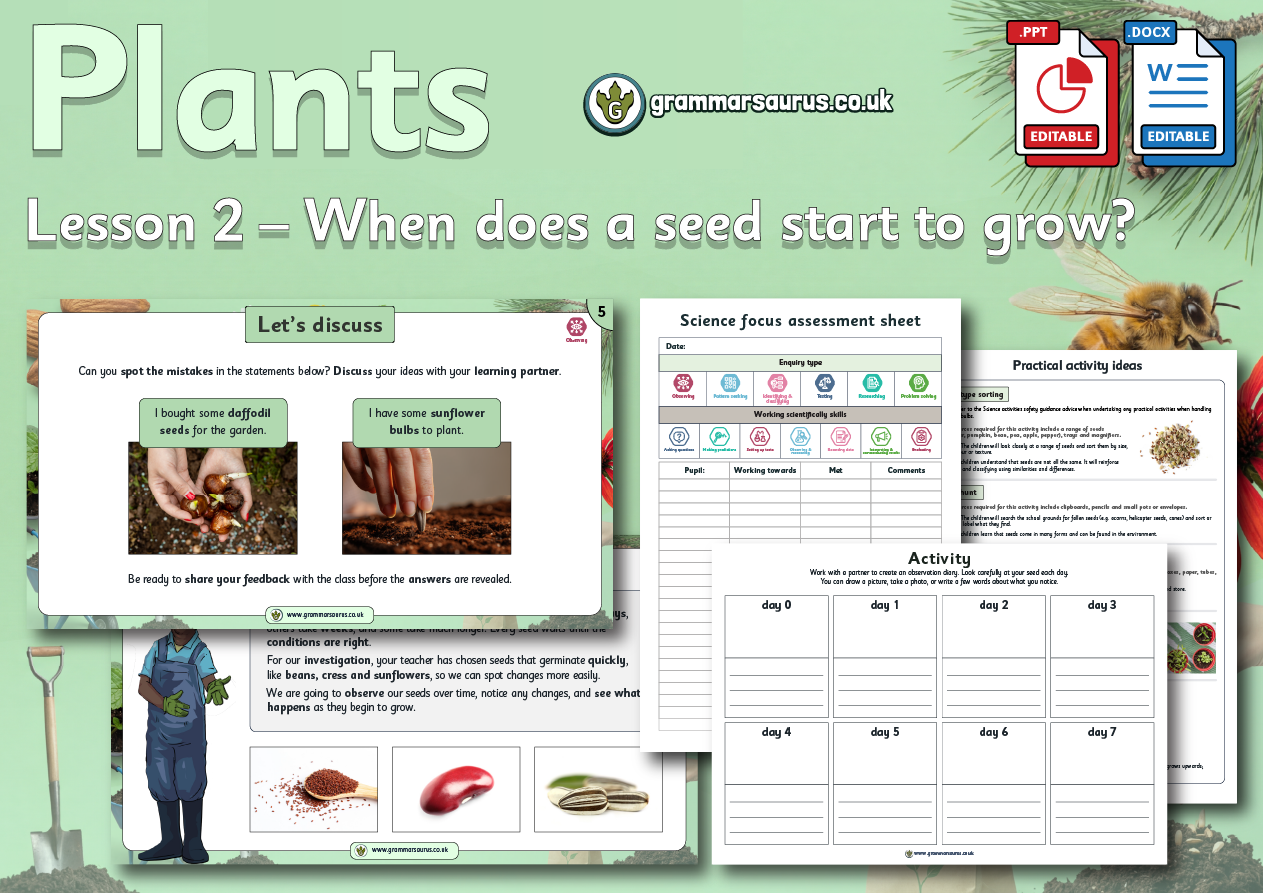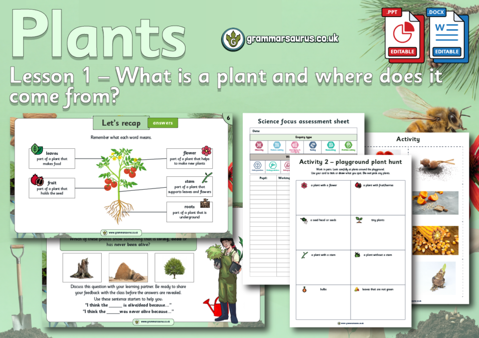 The file includes the following resources: - editable teaching presentation - editable activity photo sheet - editable activity sorting table - editable activity plant hunt sheet - editable practical activity ideas - editable lesson plan - editable focus assessment worksheet