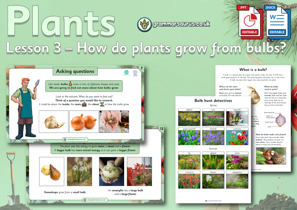 This editable differentiated lesson pack focuses on how plants grow from bulbs. Children explore real bulbs or photographs, ask their own research questions, and use fact cards to find answers. They learn that bulbs have layers that store energy, roots that grow from the bottom, and shoots that grow from the top. The lesson builds enquiry skills through observing, questioning and explaining how bulbs survive winter and make new plants.