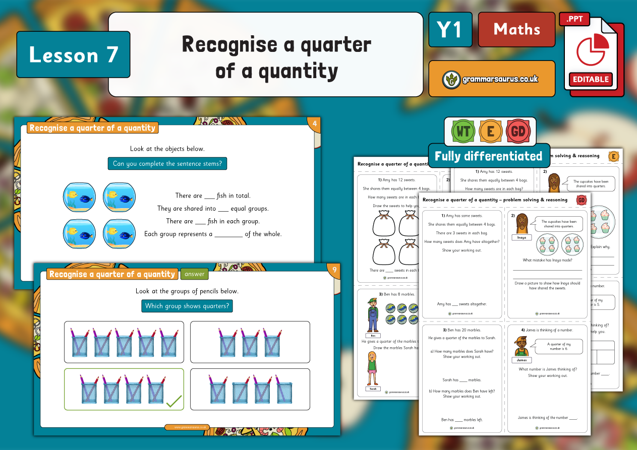 In this lesson, children will use their understanding of quarters to find a quarter of an object or a shape. They will practice representing a quarter in a variety of ways using different objects and shapes.