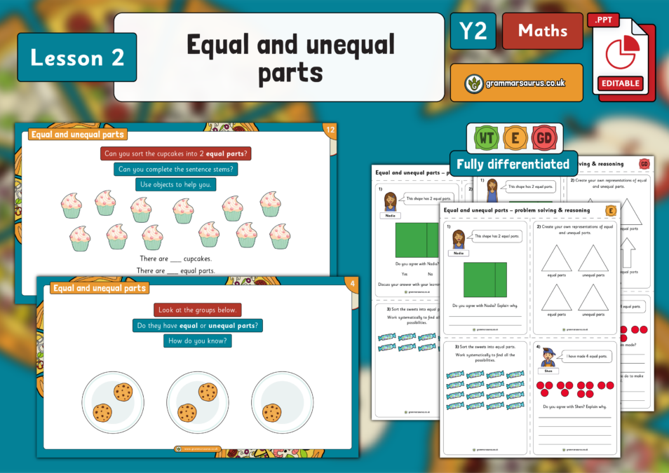This resource revisits the concept of ‘half’ whilst introducing the students to the notation of 1/2. Different representations of 1/2 are explored with discussion-based activities. There is a teaching presentation accompanied by differentiated activities with a range of fluency, reasoning and problem-solving questions.