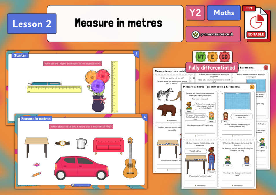 In this lesson, children use metre sticks to measure objects longer than a metre. They make decisions on whether to use centimetre rulers or metre sticks for different objects and see the link between 100 cm and 1 m.