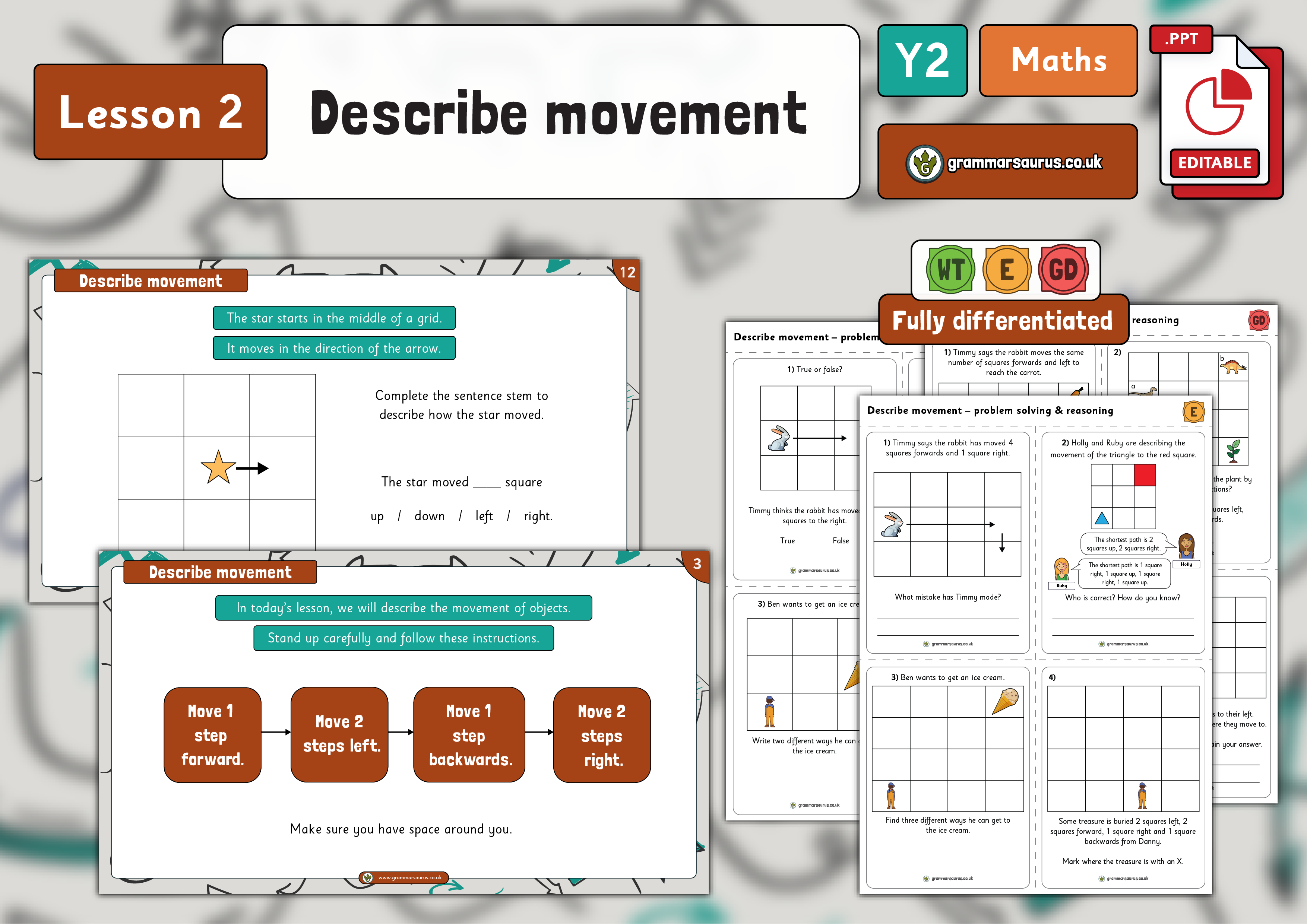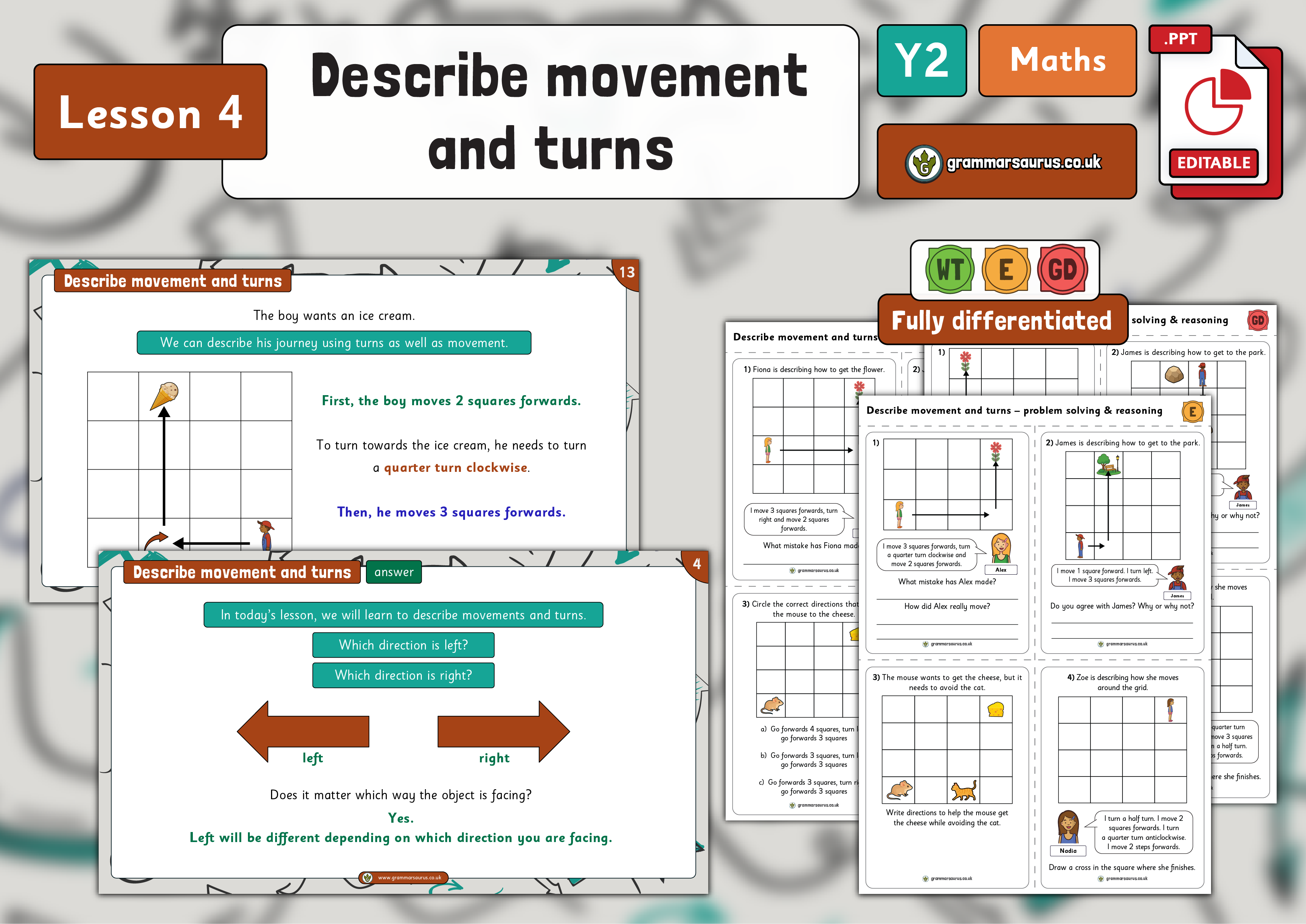Use mathematical vocabulary to describe position, direction and movement, including movement in a straight line and distinguishing between rotation as a turn and in terms of right