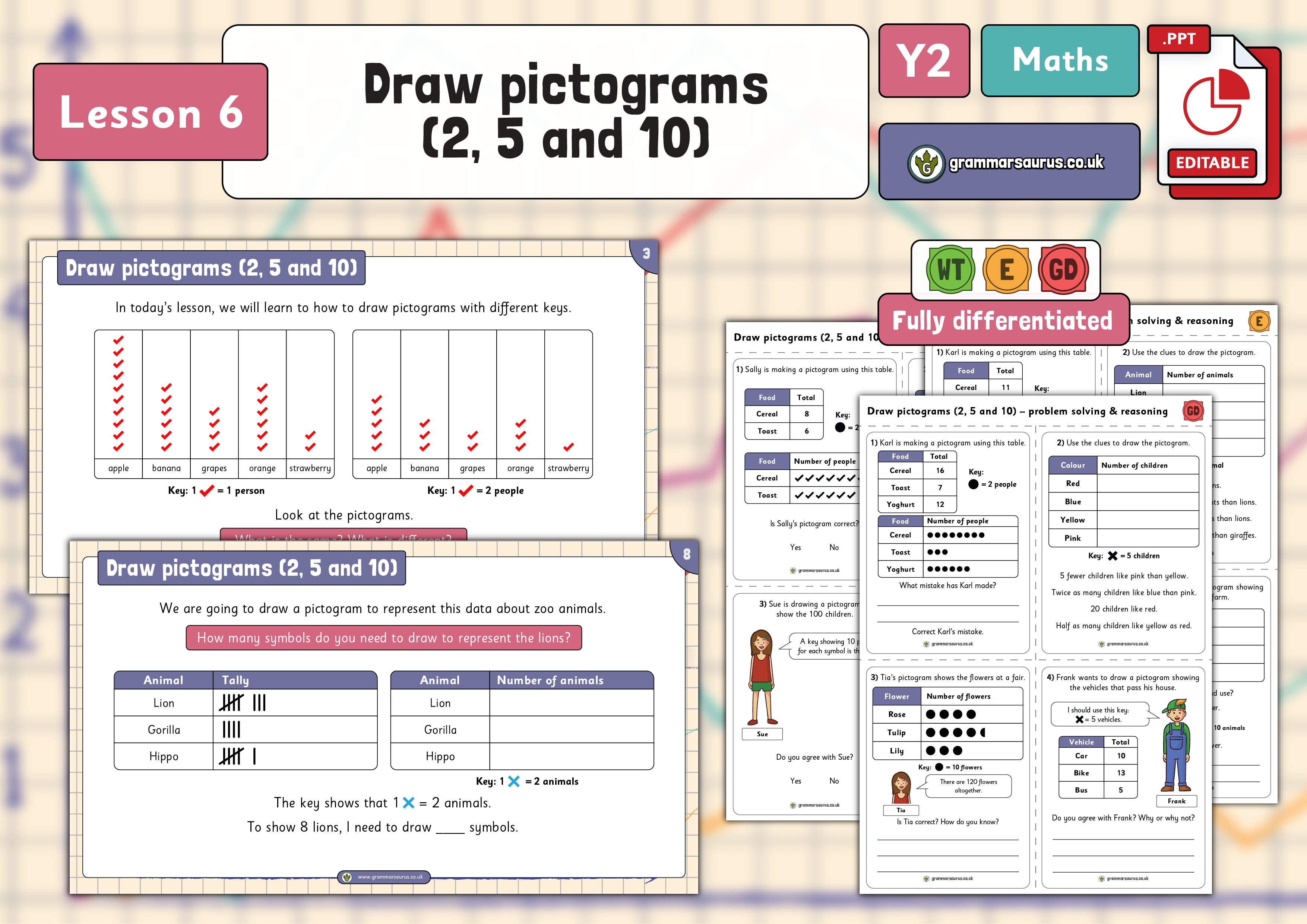 Interpret and construct simple pictograms, tally charts, block diagrams and simple tables