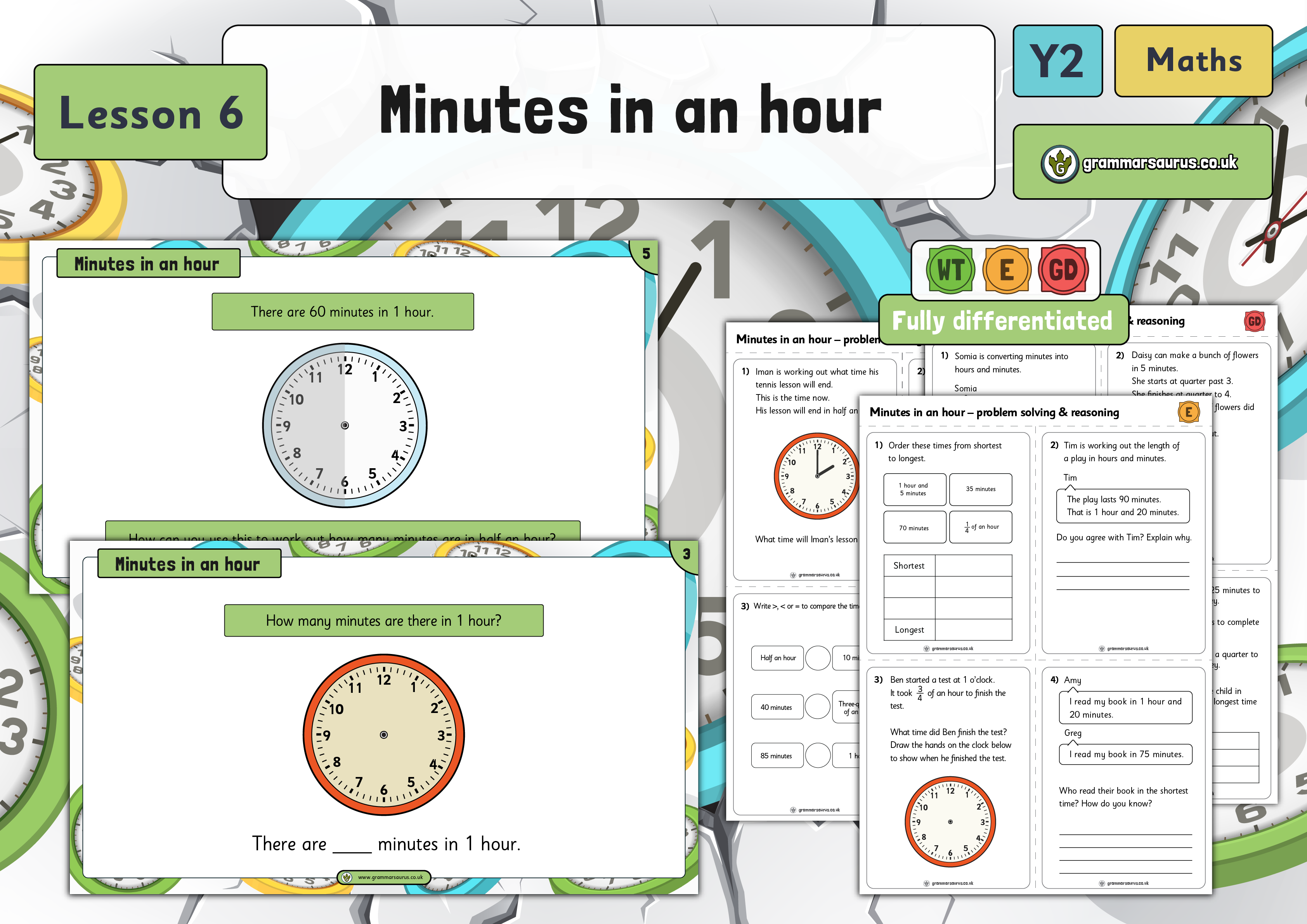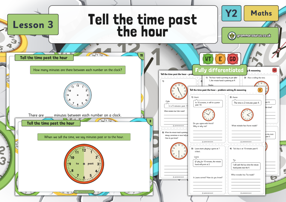 National Curriculum objectives:Tell and write the time to five minutes, including quarter past/to the hour and draw the hands on a clock face to show these times Differentiation:There are three levels of differentiation in this pack: ‘working towards,’ ‘expected’ and ‘greater depth’. Level of this pack: Age: 6-7...