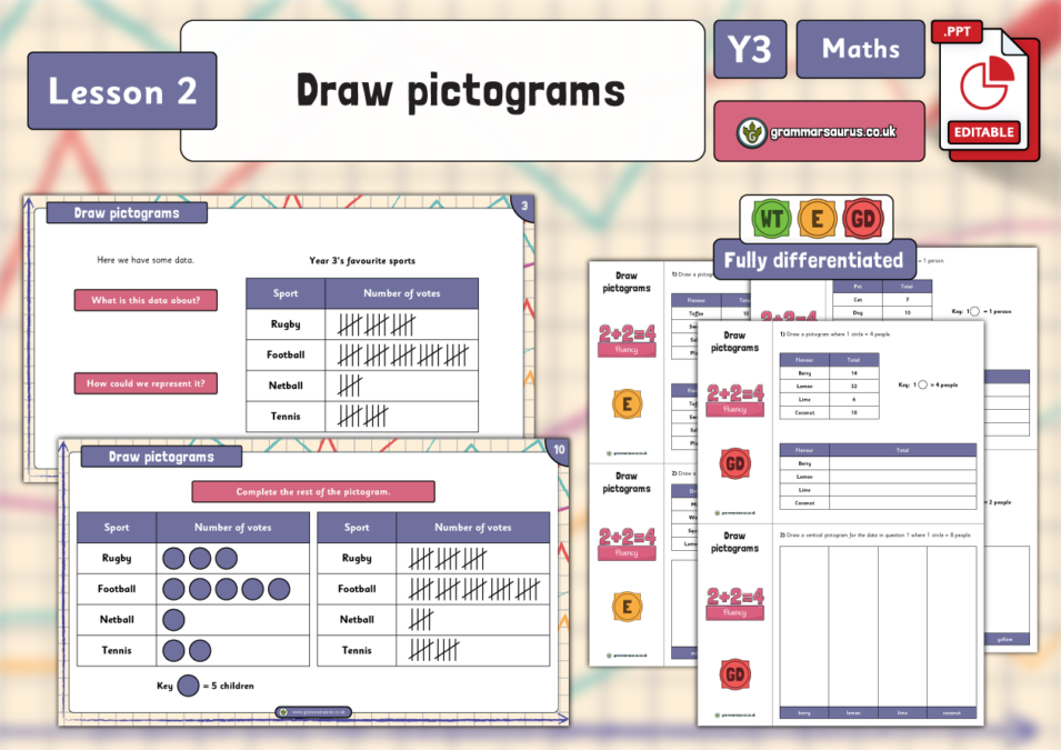 In this lesson, children will build on their previous learning to construct their own pictograms. They select their own symbols for keys and consider the value of the key depending on the data being represented.