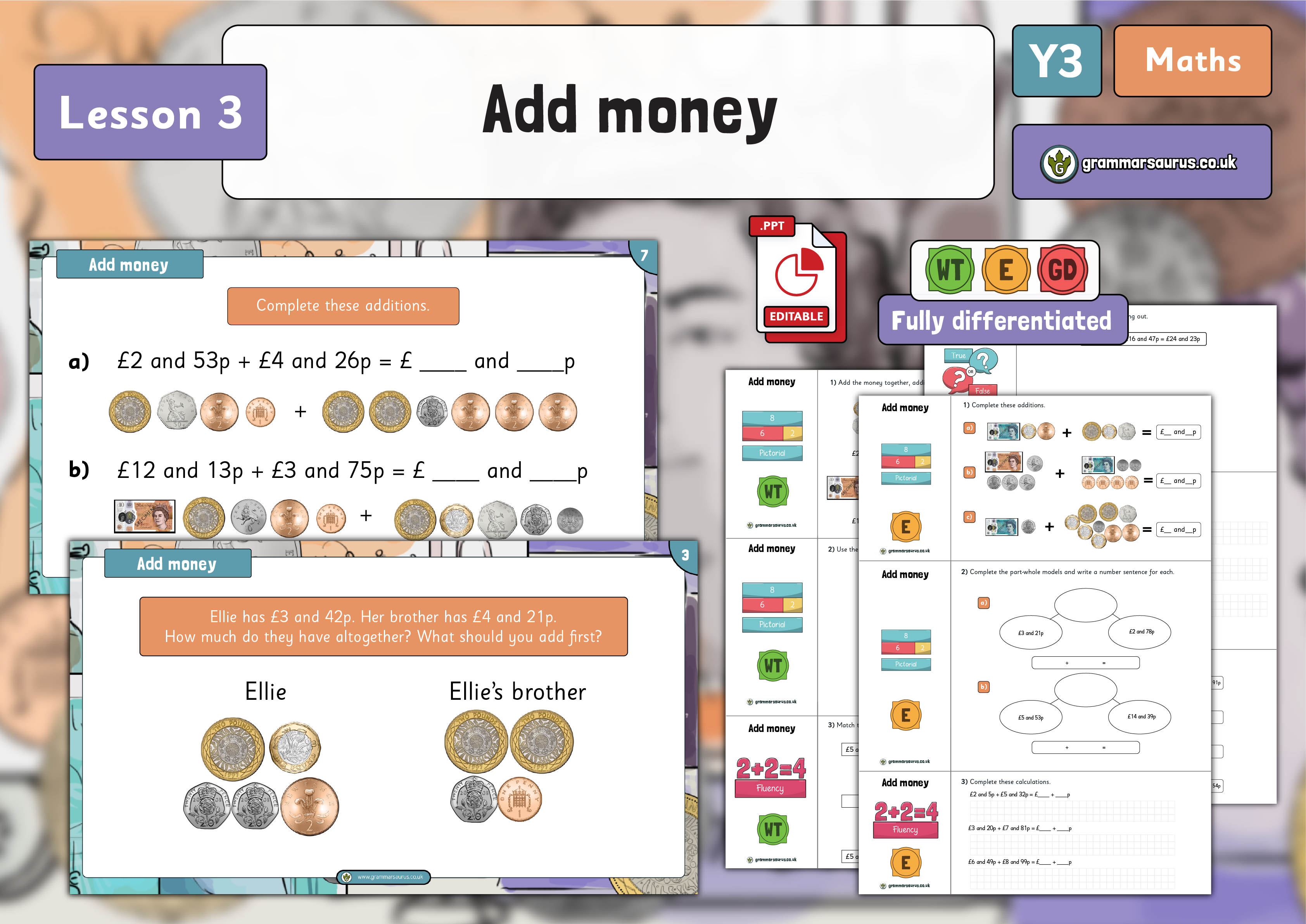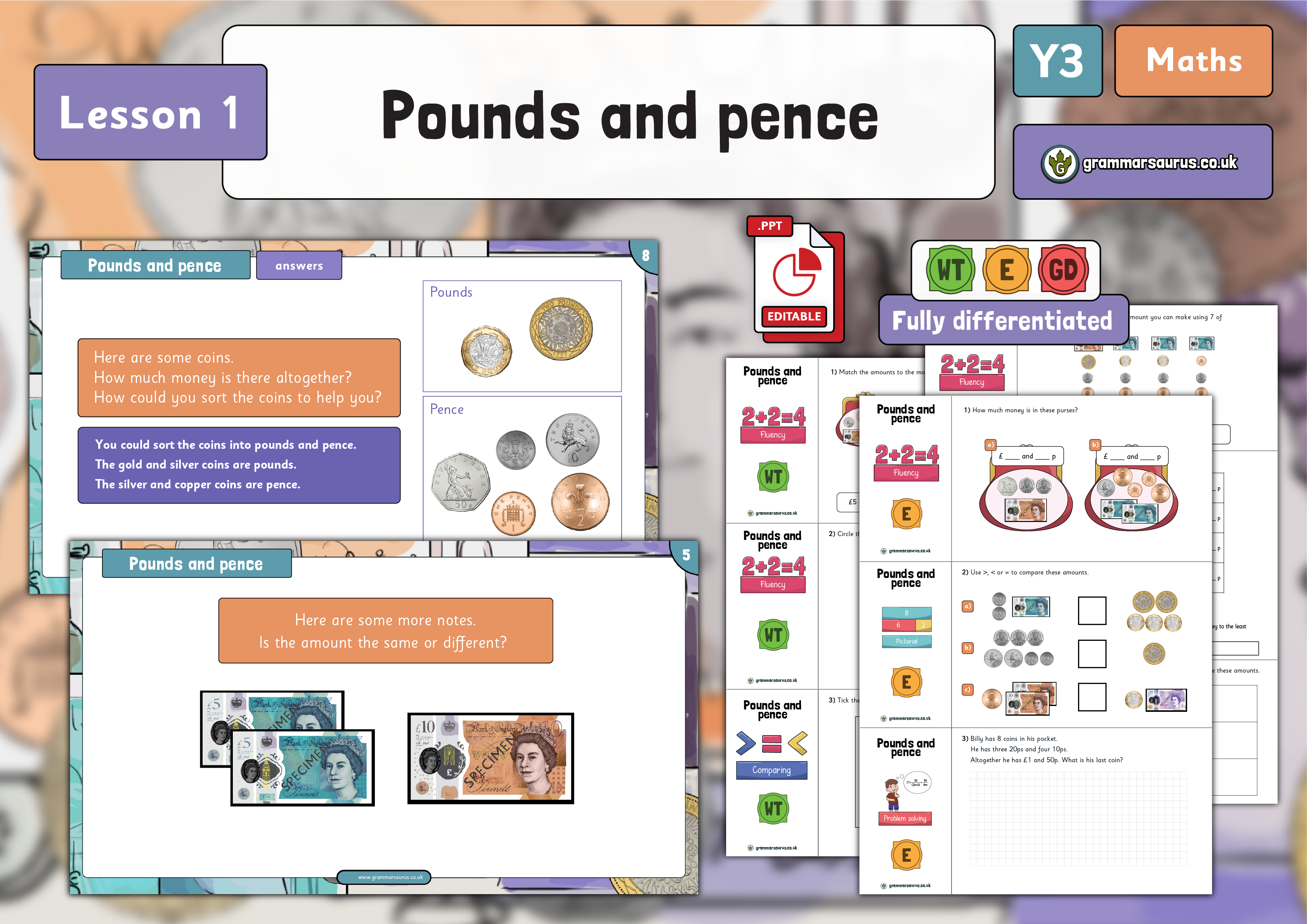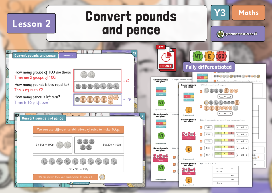 In this lesson, children further their understanding of the value of money by converting pence into pounds and pence by understanding that 100p is equal to £1. Various representations of money are used to help identify groups of 100p and help with conversions.