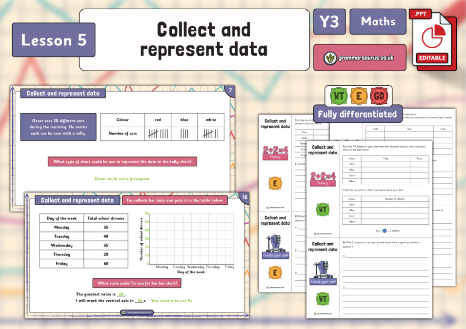 DescriptionIn this lesson, children develop understanding from the previous lessons and collect and represent their own data. They consider what questions to ask, how to collect the data and then how best to represent the data.