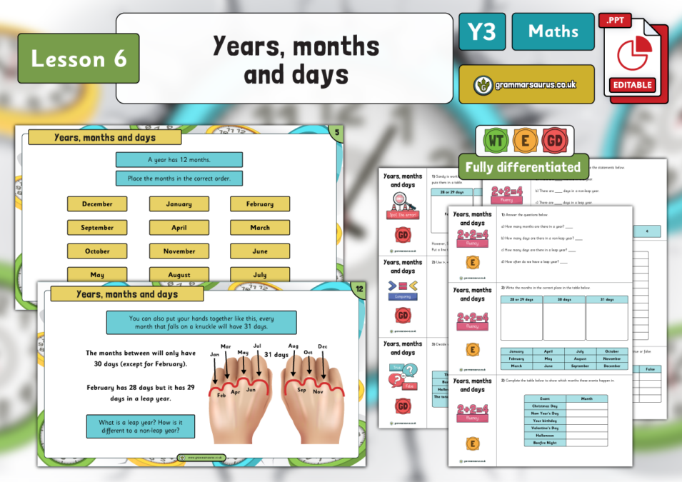 In this lesson, children focus on learning the number of days in months, months in a years and so on using calendars, including leap years. They apply this learning to events in the year. Children will also look at the school year and how it differs to a calendar year.