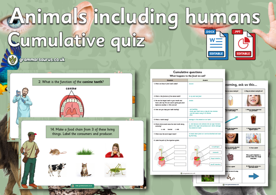 Teachers can use this cumulative quiz and the questions to assess children throughout the Year 4's 'Animals including humans ' unit. The cumulative quiz and questions can also be used at the end of each lesson to give immediate feedback to inform future planning and identify children who do not understand.