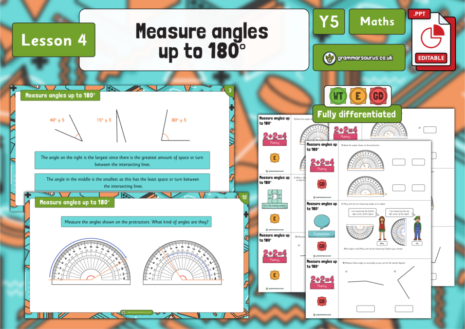 In this lesson, children measure angles up to 180° using a protractor. They measure angles where the protractor is placed for them, then move to placing the protractor themselves. They should use their knowledge of estimation to support them in reading the right scale. This lesson includes a teaching presentation accompanied by differentiated activities with a range of fluency, reasoning and problem-solving questions, as well as 3 sets of extra fluency questions.