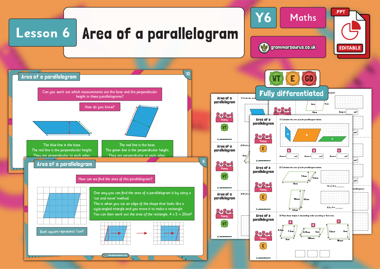 In this lesson, children extend their knowledge from working out the area of a right-angled triangle to working out the area of any triangle. They still use the same formula to do this. They will also use this to work out the shape of composite shapes made up by more than one triangle. This resource teaches the students to use the formula for the area of a rectangle to find the area of a right-angled triangle. There is a teaching presentation and three levels of worksheets (working towards, expected and greater depth) with a range of fluency, reasoning and problem solving questions.