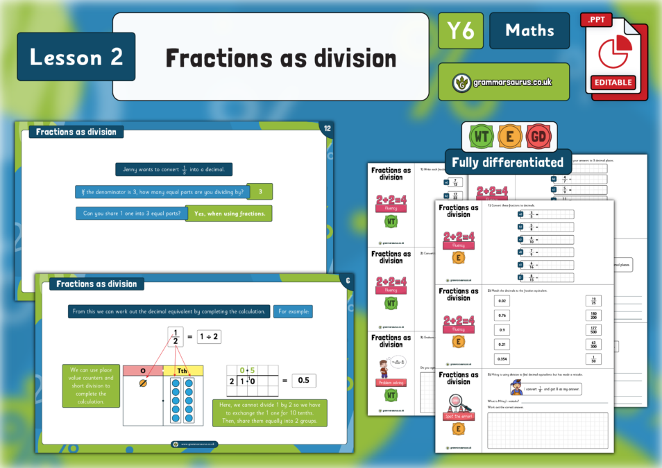 In this lesson, children learn how to find equivalences for fractions, decimals and percentages and how to convert between them. There is a teaching presentation and three levels of worksheets (working towards, expected and greater depth) with a range of fluency, reasoning and problem solving questions.