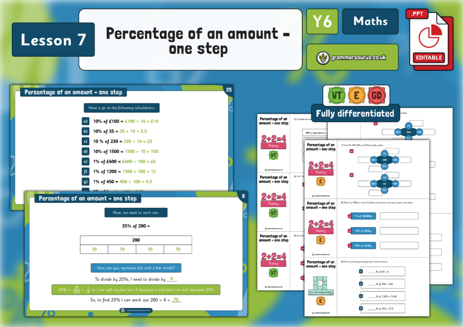 Year 6 Fractions, Decimals and Percentages – Percentage of an amount – one step – Lesson 7