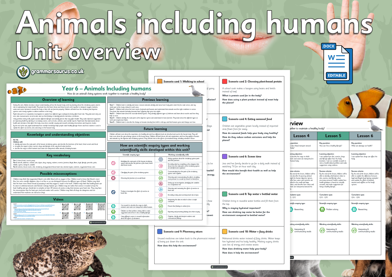 Teachers can use this cumulative quiz and the questions to assess children throughout the Year 6's 'Animals including humans ' unit. The cumulative quiz and questions can also be used at the end of each lesson to give immediate feedback to inform future planning and identify children who do not understand. The file includes the following resources: - cumulative quiz presentation - cumulative quiz answers - cumulative 'Ask us this' worksheet - cumulative 'Ask us this' answers Updated to the Grammarsaurus Curriculum 2.0...
