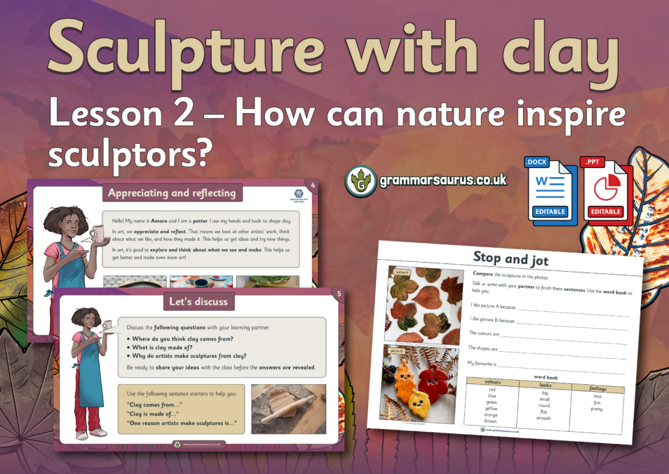 This lesson focuses on the core art skill of appreciating and reflecting. Children will look closely at examples of sculptures and talk about how they are different from flat art. They will explore the work of artists who use clay and nature for inspiration, learning about imprinting by pressing natural objects into clay. Through discussion and experimentation, they will describe what they notice and share how the artwork makes them feel.