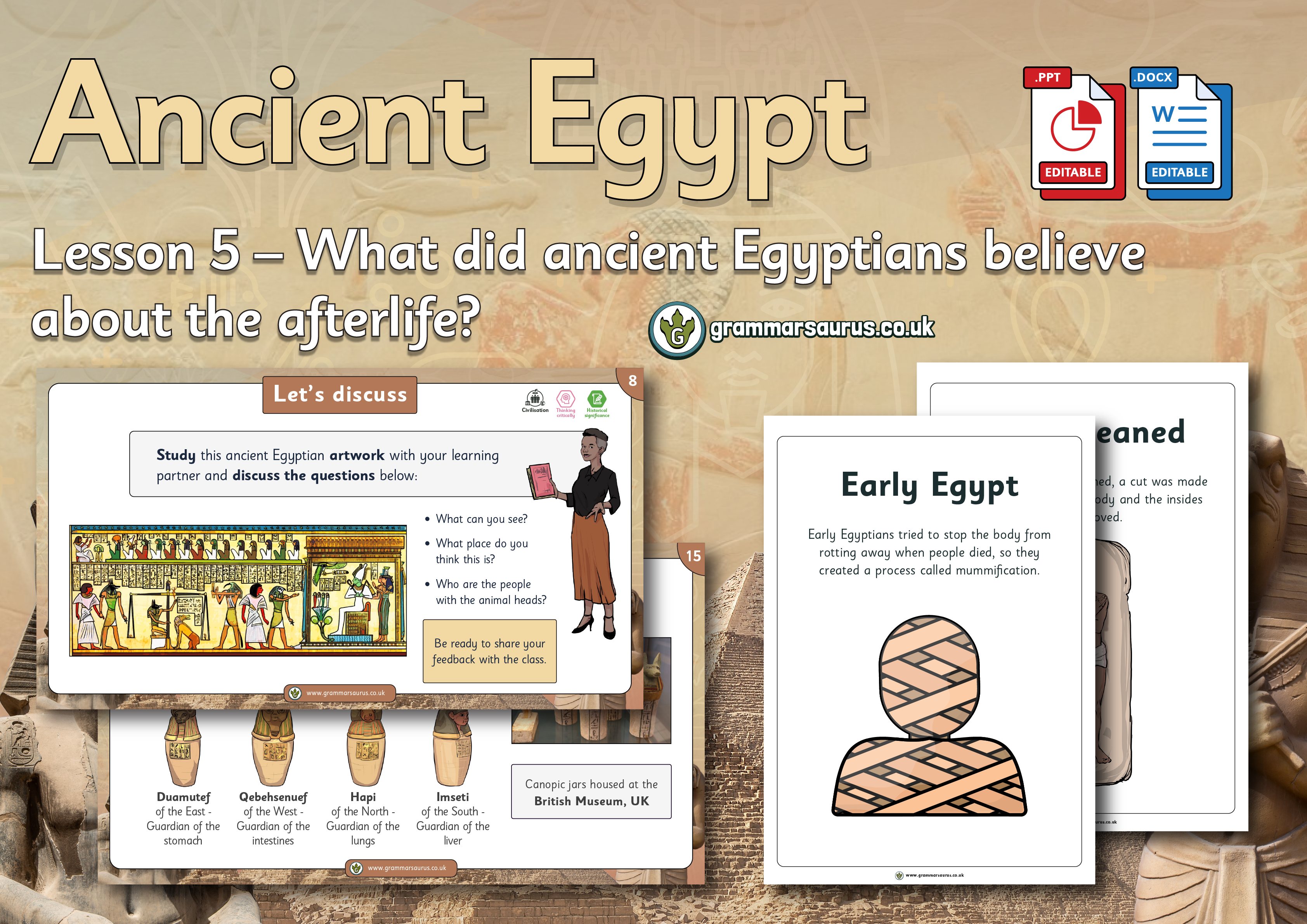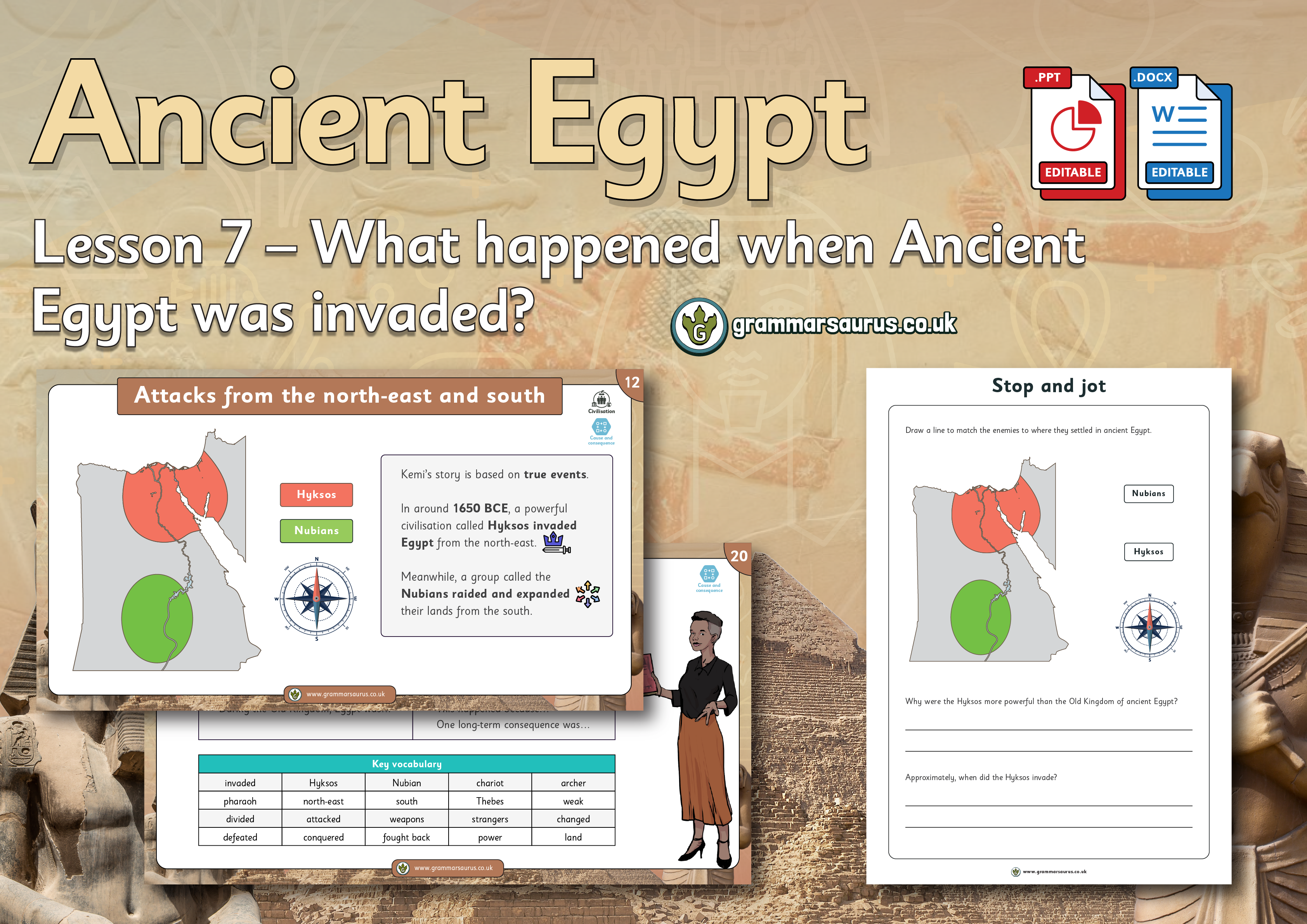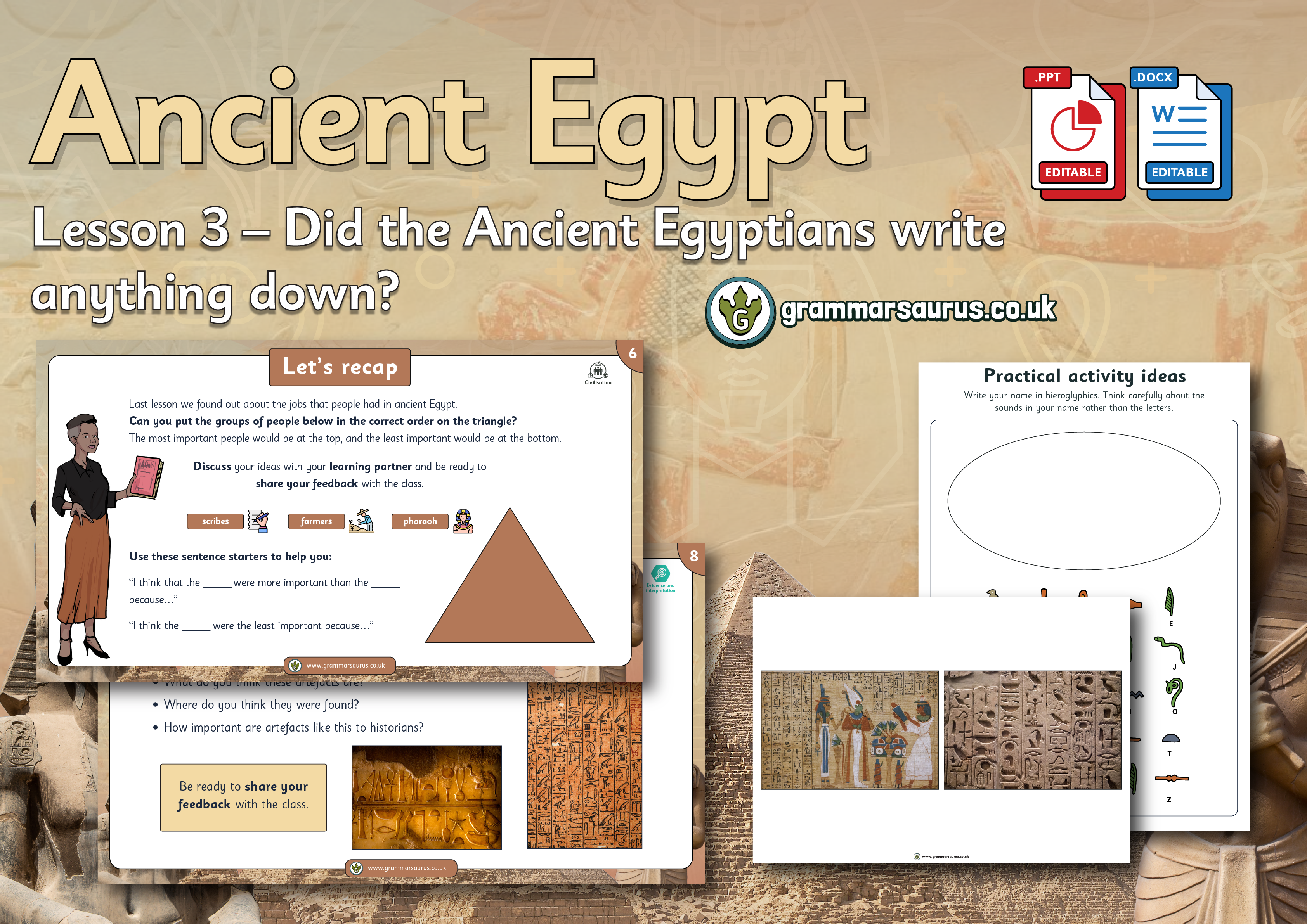 This editable lesson pack focuses on the different theories historians have of how the pyramids were built. The file includes the following resources:- editable teaching presentation - editable activity worksheets - editable practical activity ideas - editable lesson plan - editable focus assessment worksheet National Curriculum objectivesHistory: Key Stage 2The children should be taught the achievements of the earliest civilisations – an overview of where and when the first civilisations appeared and a complete a depth study of Ancient Egypt.