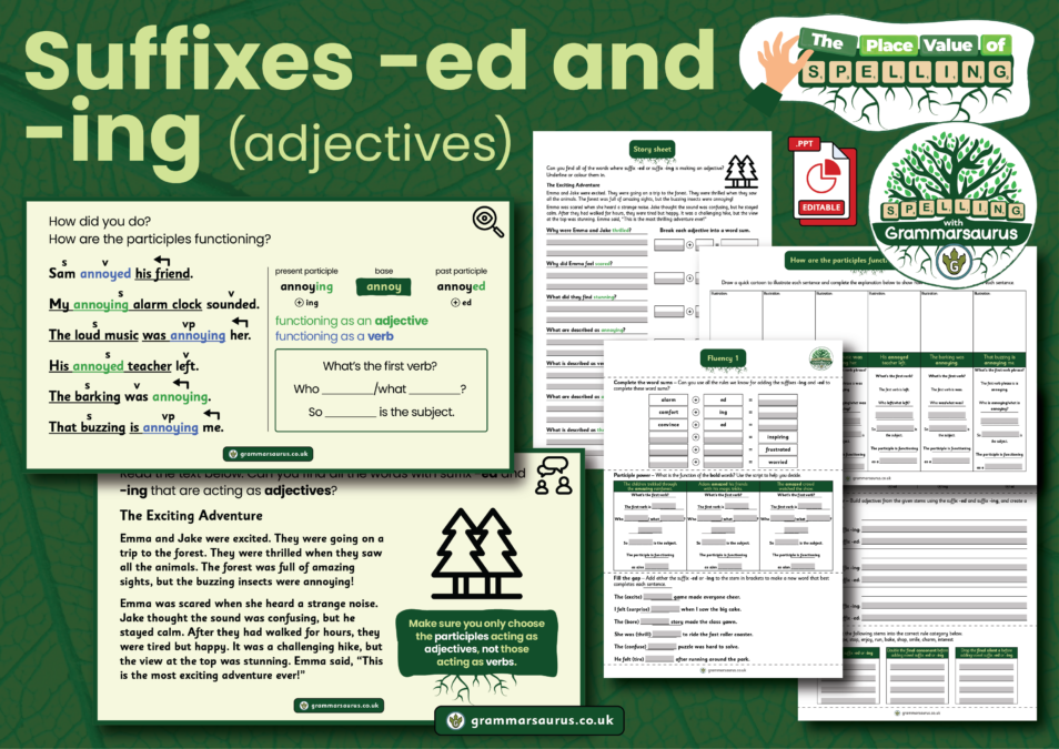 In this objective, children will learn how to add suffixes -ed and -ing to bases to form adjectives. Over four 20-minute lessons, they will:· Learn that the suffixes -ed and -ing can be added to bases to form past and present participles· Learn that these words form an adjective in a sentence· Practise identifying verbs in verb phrases· Revisit spelling rules for adding suffixes -ed and -ing to bases· Create word sums to identify morphemes in words