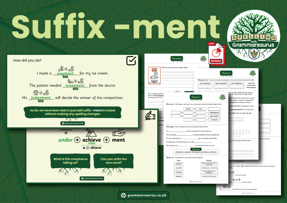 In this objective, children will learn how to add suffix -ment to a base or stem to form new words. Over four 20-minute lessons, they will:
