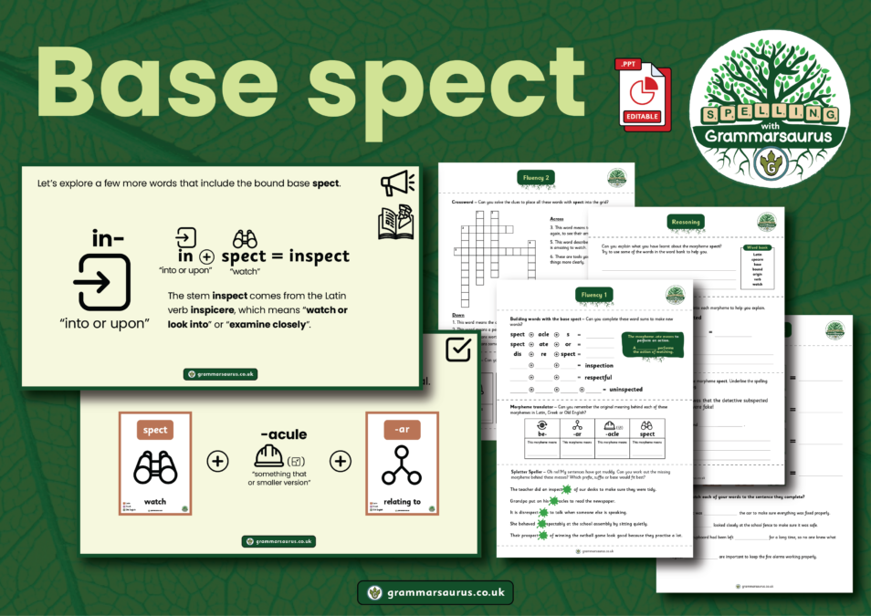 Learn that base spect is a bound base of Latin origin Explore words containing base spect which carry a sense of "watching" Build a range of word sums, understanding their morphemes and the meaning they add when combined with base spect Use matrices to form words containing base spect Reinforce learning with practical games