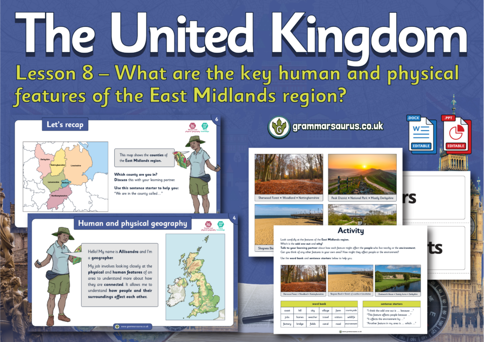 This geography lesson focuses on the human and physical geographical features of the East Midlands region of England.