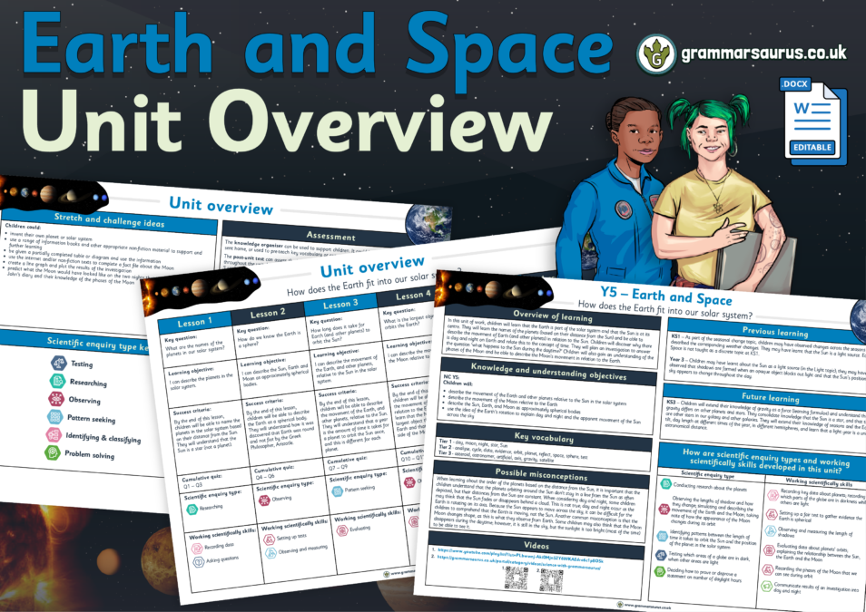 This editable unit overview provides a medium-term plan for the Y5 Earth and Space topic.