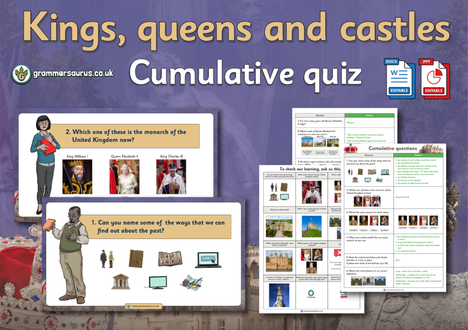 Teachers can use this cumulative quiz and the questions to assess children throughout the Year 1 'Kings, Queens and Castles' unit. The cumulative quiz and questions can also be used at the end of each lesson to give immediate feedback to inform future planning and identify children who do not understand. This is also available in a one-page document for quick reference. The'Ask us this' document has questions for verbal responses.