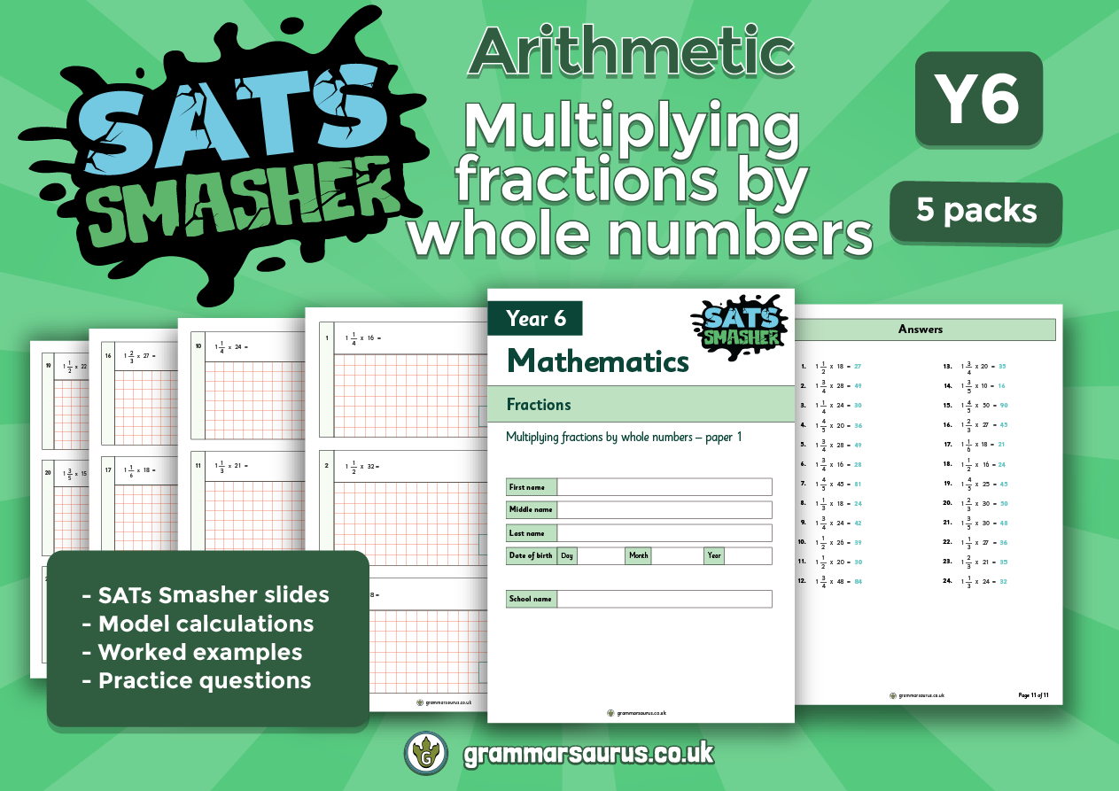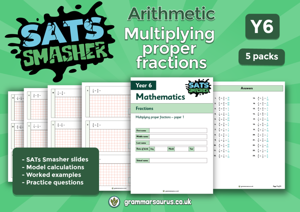 This pack contains revision teaching slides and 5 set of questions, focusing on multiplying proper fractions. Teaching slides include model questions, worked answers and practice questions. Each set of questions contains 24 questions, mirroring the question types and format found in the Key Stage 2 SATs Arithmetic papers....