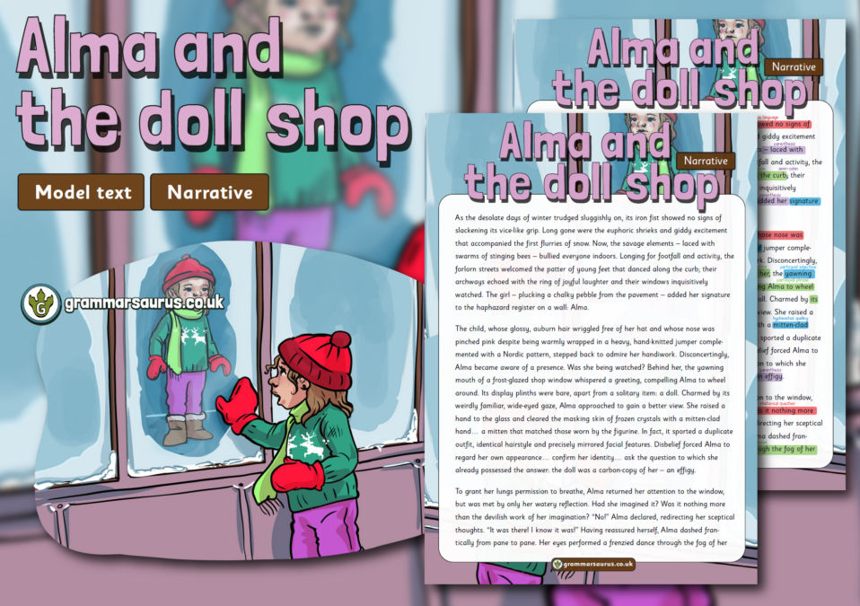 This model text is a dark narrative about a young girl who is tempted inside a mysterious shop full of dolls. It has been written to meet the Year 6 expected standard and comes with a handy annotated version detailing the text-type specific features (red), grammar (green), punctuation (purple) and spelling (blue) teaching opportunities should you wish to use this text with your learners.