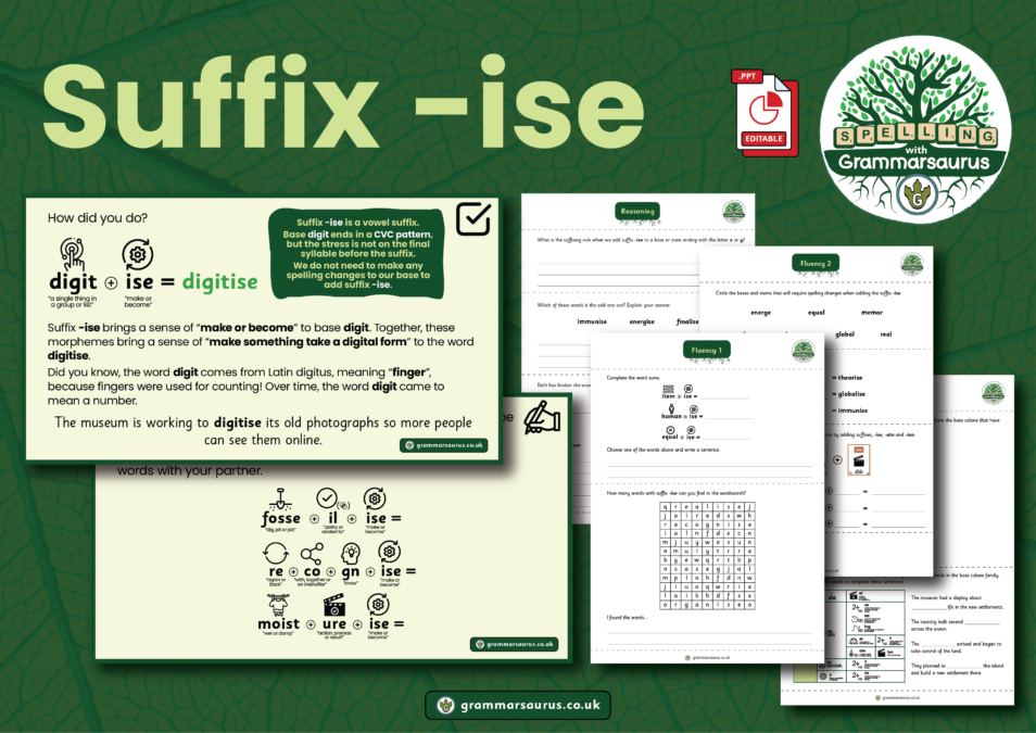 In this objective, children will learn how to add the suffix -ise to bases and stems. Over three 20-minute lessons, they will: