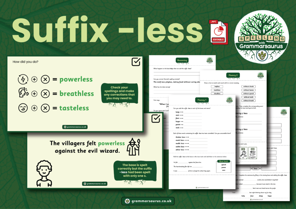 In this objective, children will learn how to add suffix -less to bases and stems to form new words. Over three 20-minute lessons, they will: