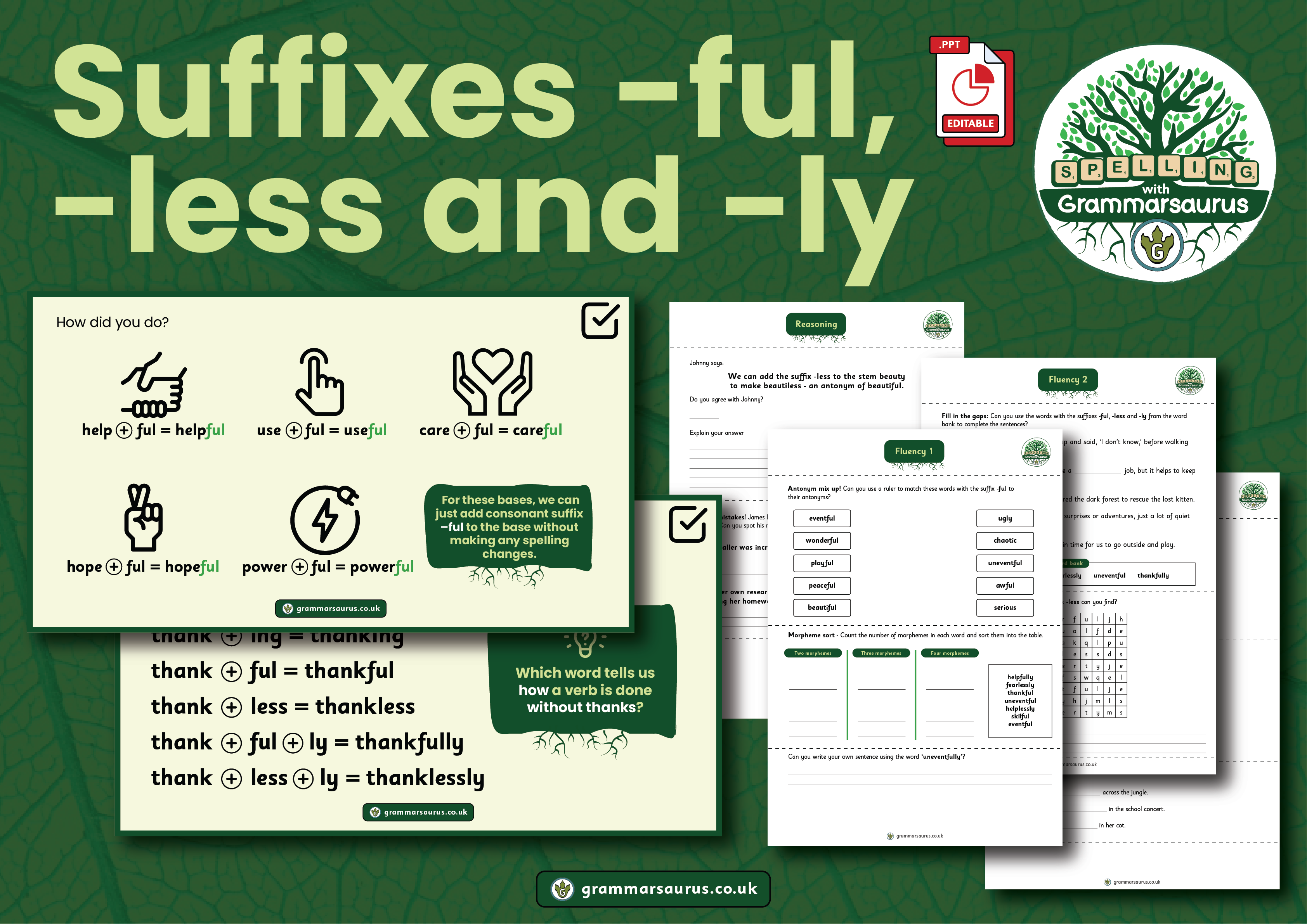 In this objective, children will learn how to add suffix -less to bases and stems to form new words. Over three 20-minute lessons, they will: