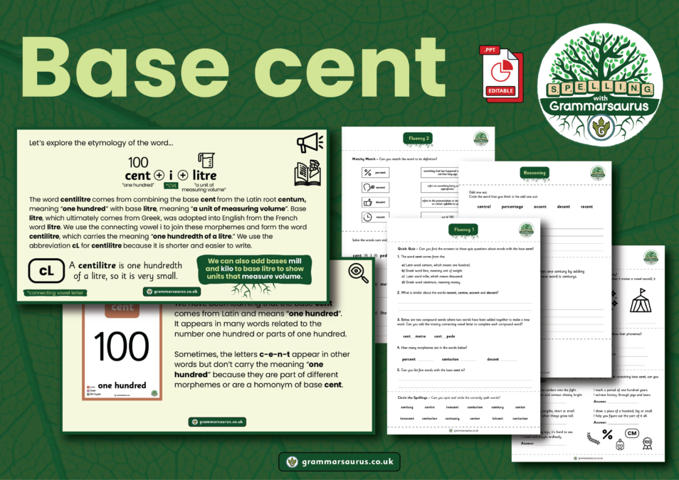 In this objective, children will learn how to add the base cent to other morphemes to make new words. Over three 20-minute lessons, they will:· Learn that base cent means one hundred · Explore the etymology of some words containing cent · Review words where the letter c makes hard and soft sounds· Learn that some words with the base cent need a connecting vowel· Build word sums· Recognise that some words with the spelling pattern c-e-n-t, do not contain base cent· Reinforce learning with practical games