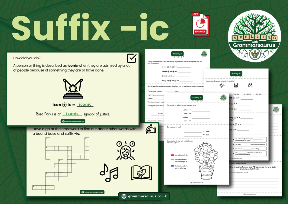 Prior to this objective, teachers should assess the suggested morphemes for a Non Chronological report using the provided materials. If learning is secure, proceed to the suffix -ic objective; otherwise, refer to resources for additional support on suffix -s, -es, suffix -y - Y2 and suffix -ous -Y3. In this objective, children will learn how to add the suffix -ic to bases and stems. Over three 20-minute lessons, they will: · Recap learning of morphemes · Learn that the suffix -ic means “related to or like” · Learn that adding the suffix -ic to a base or stem often forms an adjective · Build stems by combining morphemes · Learn that the vowel suffix -ic doesn’t trigger doubling a consonant · Explore the etymology of bound bases with the suffix -ic · Solve word sums · Sort bases and stems according to their spelling rule (Just add the suffix -ic or drop the final silent e vowel suffix and add the suffix -ic) · Reinforce learning with practical games Resources included: · Editable PowerPoint covering 3 lessons (20 minutes each) · Teacher guidance with optional activities · Supporting worksheets · A range of practical activities including a cross word · Two fluency activities (with answers) · A reasoning activity (with answers)...