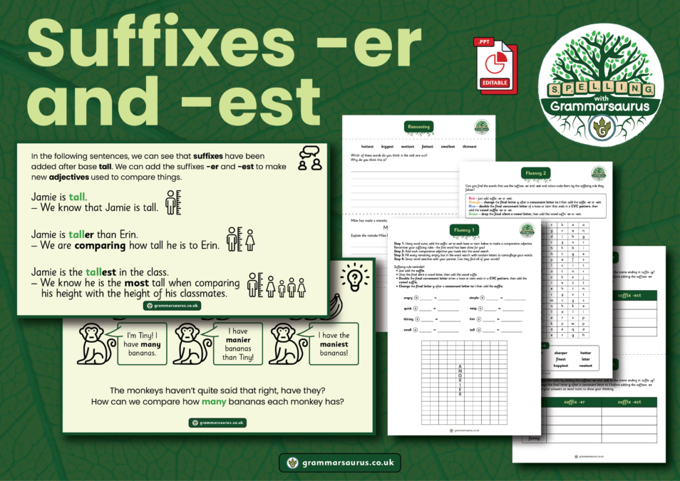 In this objective, children will learn how to add suffixes -er and -est to bases and stems. Over six 20-minute lessons, they will: