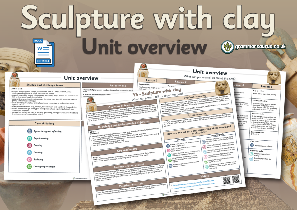 This editable unit overview offers a medium-term plan for Year 4's ‘Sculpture’ art topic.The file includes the following resources: – links to prior and future learning related to the topic – National Curriculum (NC) objectives covered in the unit – a brief overview of each lesson – common misconceptions students may have – key vocabulary for teaching and explaining - core and supporting skills covered in the unit – practical materials required – links to YouTube how to videos – ideas for stretching and challenging students – suggestions for assessment Updated to the Grammarsaurus Curriculum 2.0...