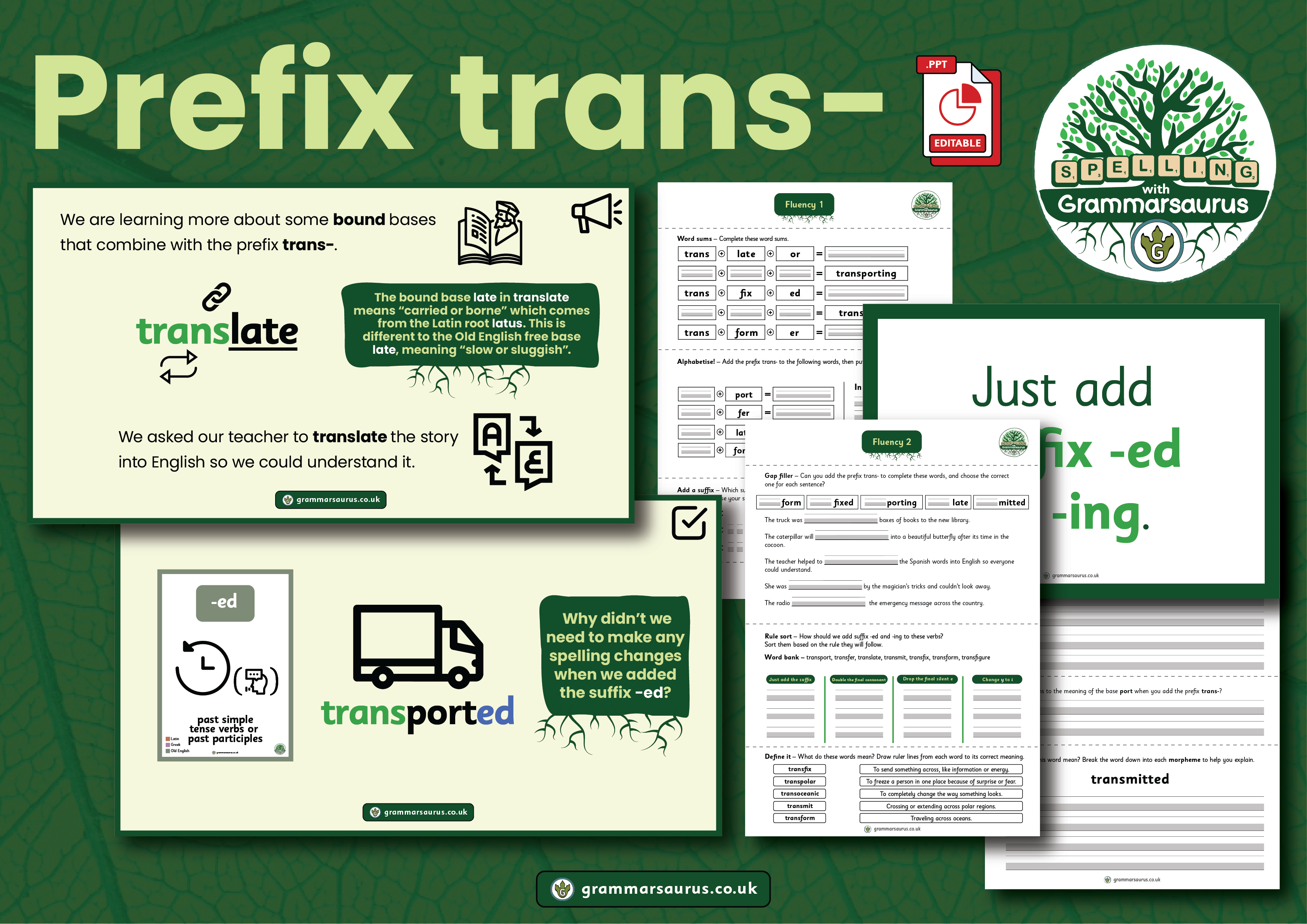 In this objective, children will learn how to add the prefix de- to bases. Over three 20-minute lessons, they will: · Learn how adding the prefix de- to a base changes the words meaning · Learn that adding the prefix de- to nouns turns them into verbs · Add the new prefix and other morphemes to bases to make new words · Recognise the difference between bound and free bases with the prefix de- · Learn the etymology of new bound bases Resources Included: · Editable PowerPoint covering 3 lessons (20 minutes each) · Teacher guidance with optional activities · Supporting worksheets including word sum activities · A deconstruct it game with base, suffix and prefix de- cards · A teacher word list · 2 fluency activities (with answers) · 1 reasoning activity (with answers)- editable google slides presentation...