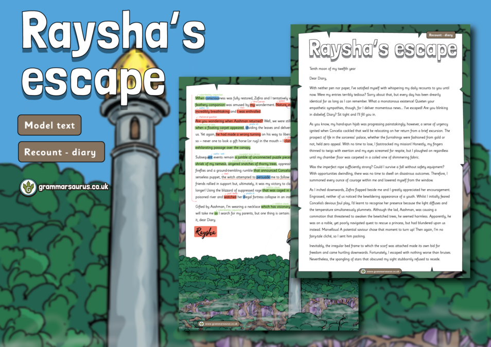 This model text is a diary entry written in the role of a fairy tale character. It details her escape from a tower prison. It has been written to meet the Year 5 expected standard and comes with a handy annotated version detailing the text-type specific features (red), grammar (green), punctuation (purple) and spelling (blue) teaching opportunities should you wish to use this text with your learners.