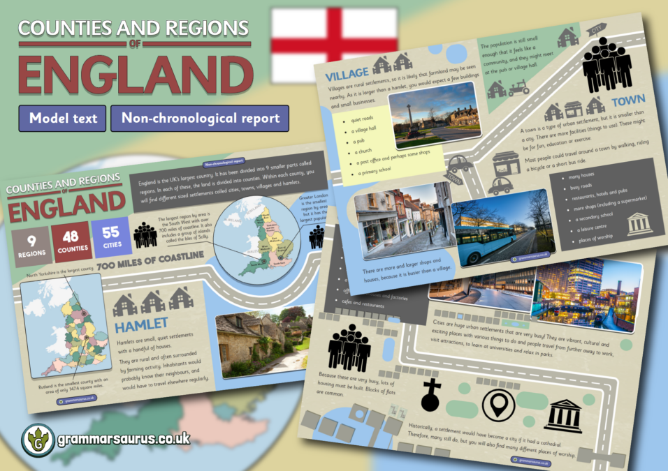 This model text is a non-chronological report about regions and settlements of England. It has been written to meet the Year 3 expected standard and comes with a handy annotated version detailing the text-type specific features (red), grammar (green), punctuation (purple) and spelling (blue) teaching opportunities should you wish to use this text with your learners.